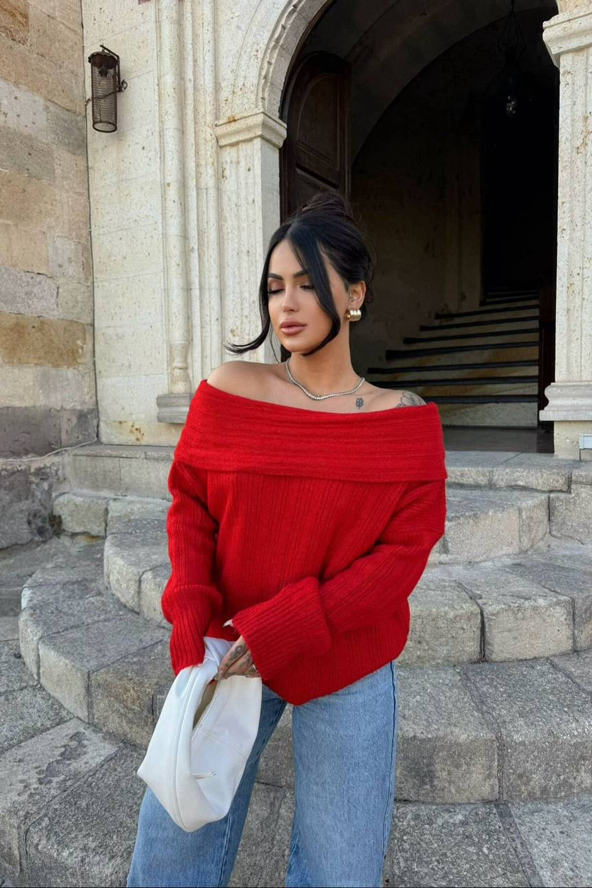 OFF SHOULDERS ONE COLOR WOMEN SWEATER RED/E KUQE