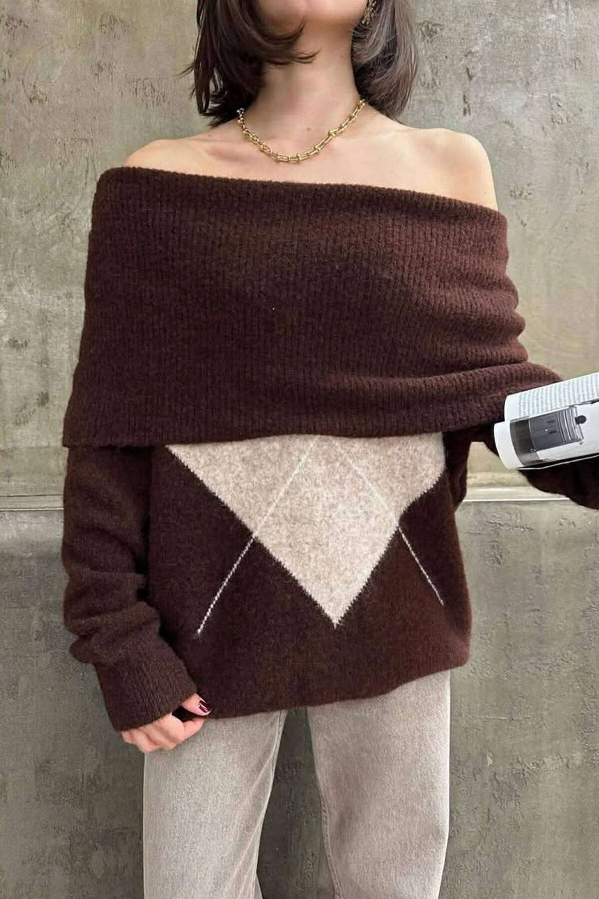 OFF SHOULDERS RHOMBUS DESIGN WOMEN SWEATER DARK BROWN/KAE