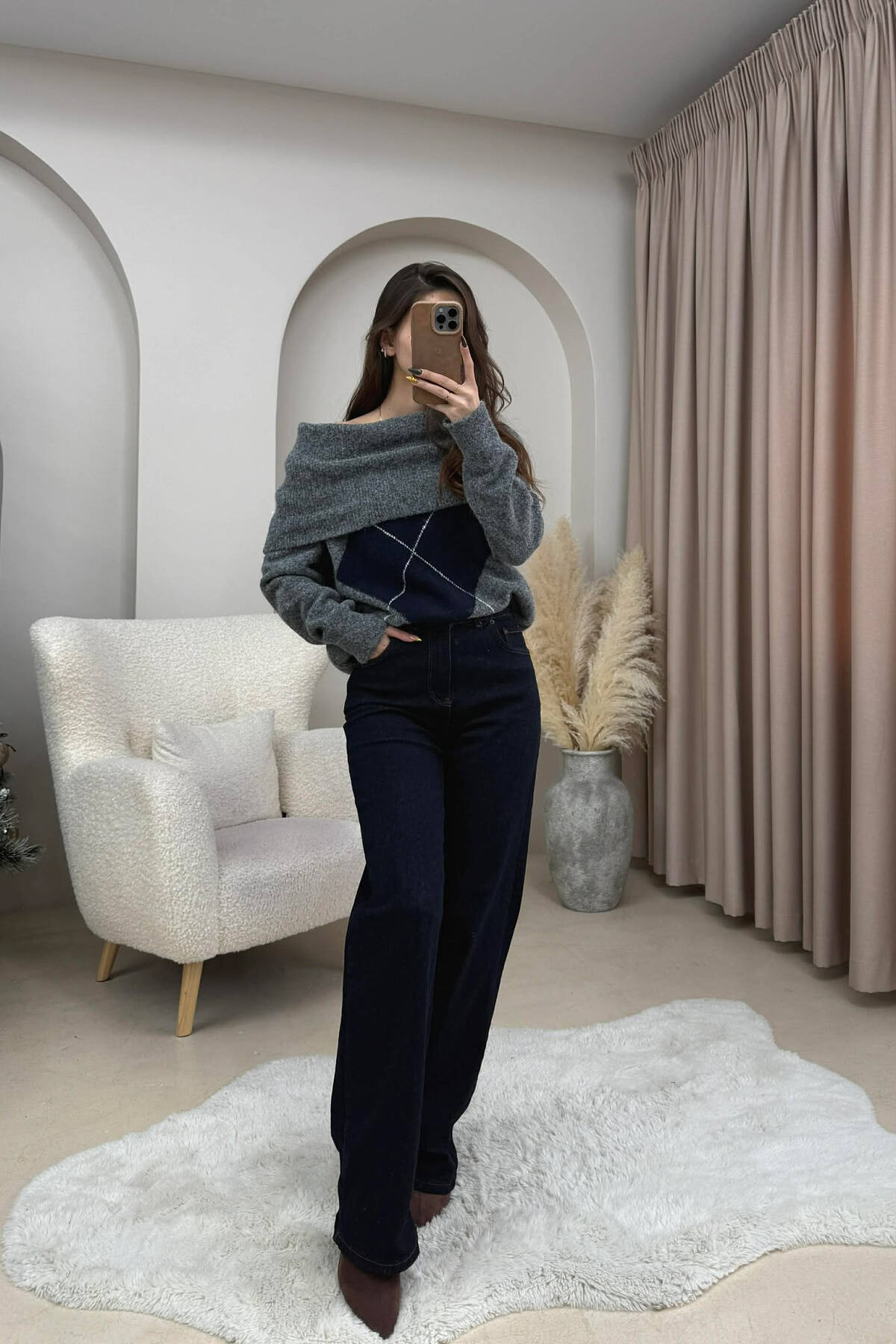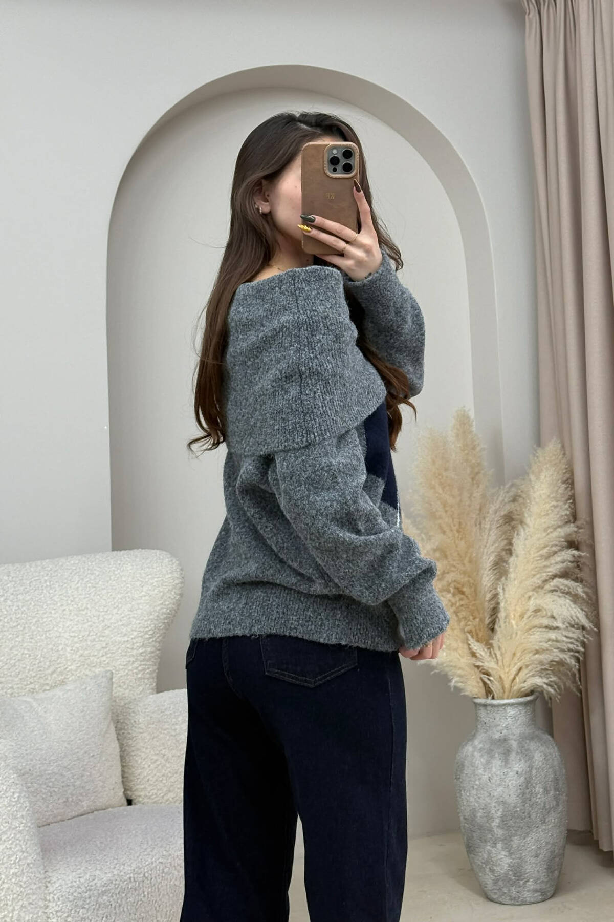 OFF SHOULDERS RHOMBUS DESIGN WOMEN SWEATER GREY/GRI