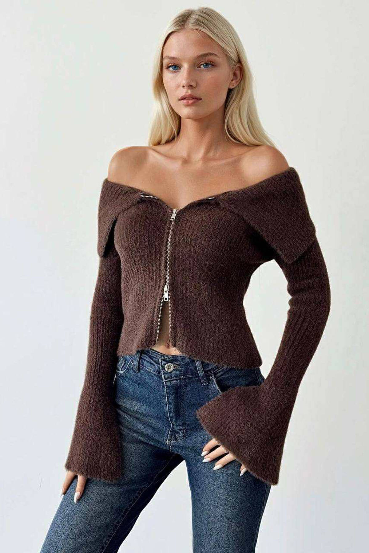 OFF SHOULDERS ZIPPERED WOMEN CARDIGAN BROWN/KAFE