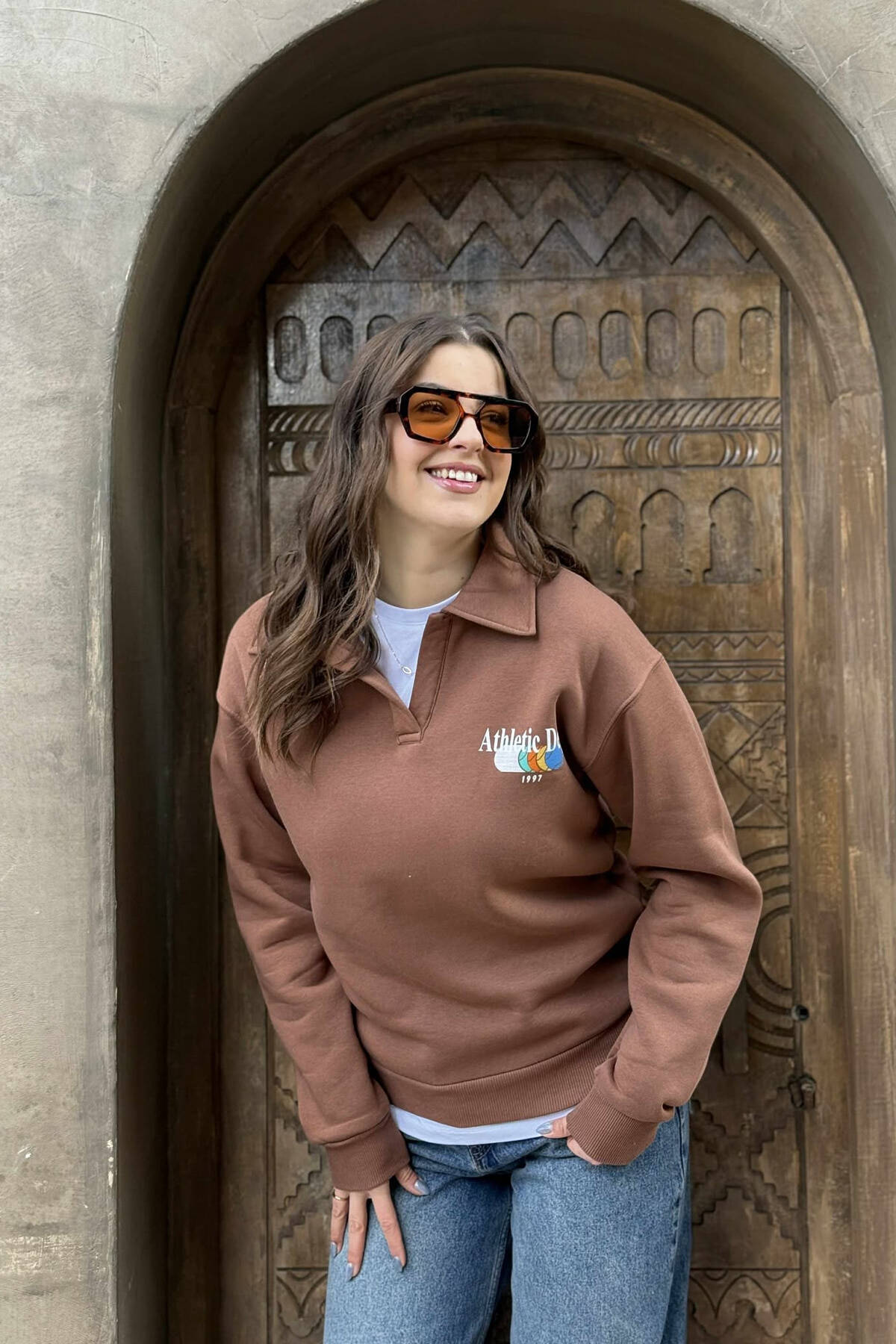 ZIPPER NECK WRITTINGS FLUFFY WOMEN SWEATSHIRT BROWN/KAFE