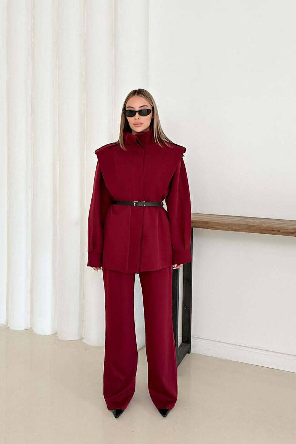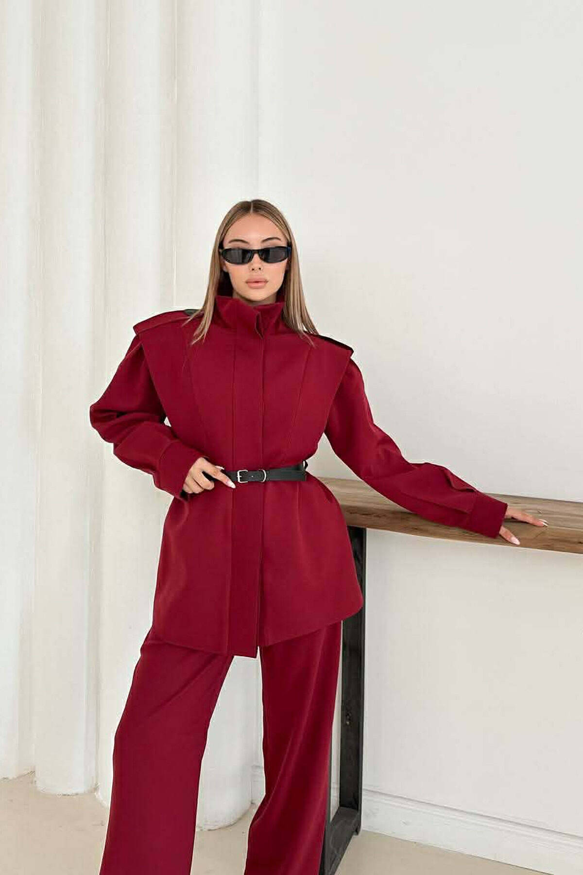 ONE COLOR BELT DETAIL HIDDEN BUTTON UP JACKET+ TROUSERS WOMEN SET BURGUNDY/VISHNJE