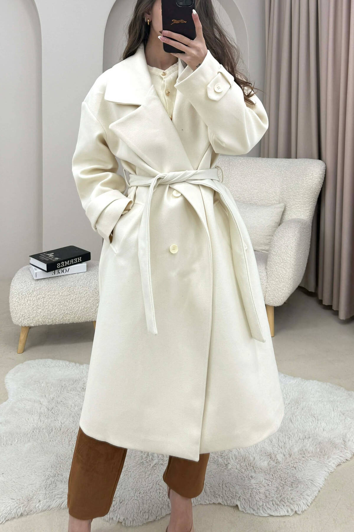 ONE COLOR BELT DETAIL LONG WOMEN TRENCH COAT ANTIQUEWHITE/ANTIKE