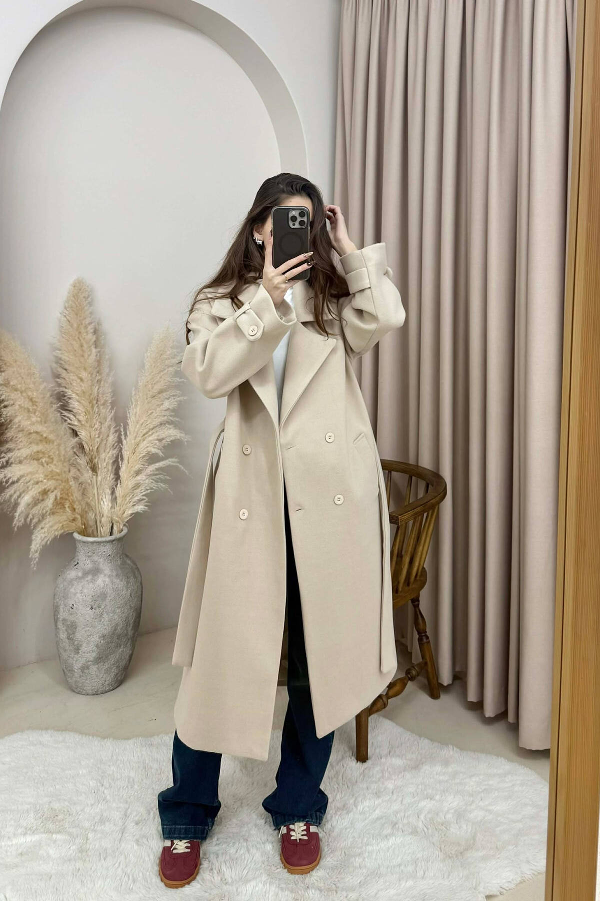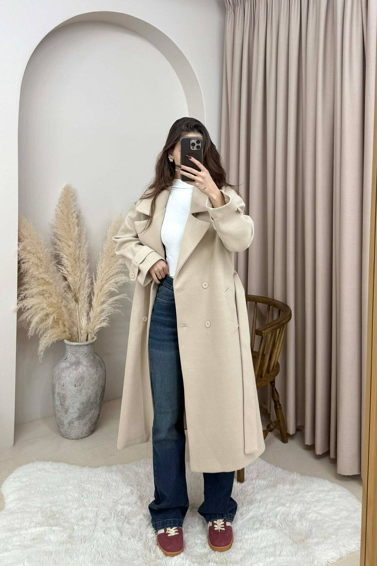 ONE COLOR LONG BELT DETAIL WOMEN COAT BEIGE/BEZHE