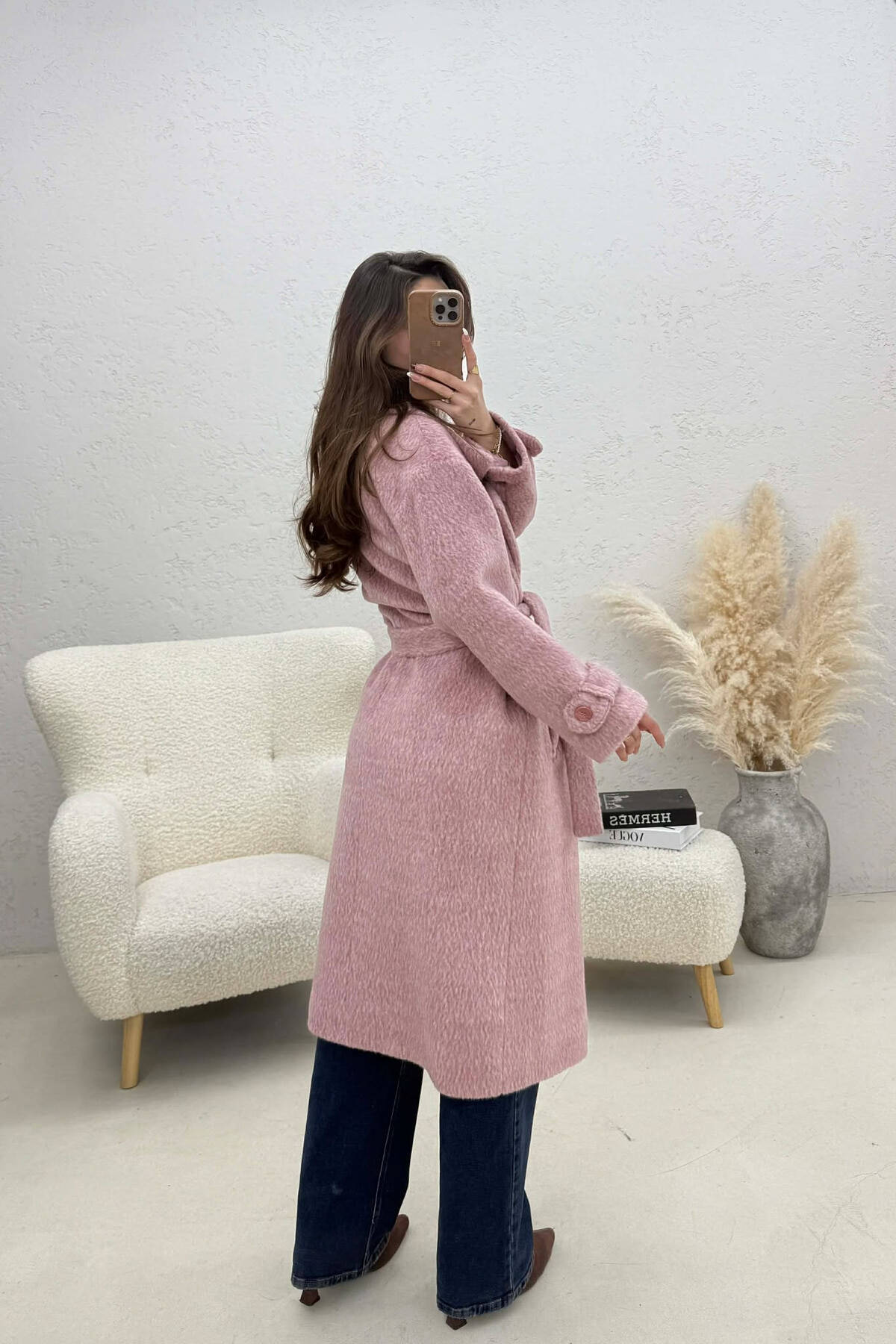 ONE COLOR LEATHER BUTTONED BELT DETAIL LONG WOMAN COAT BROWN/KAFE