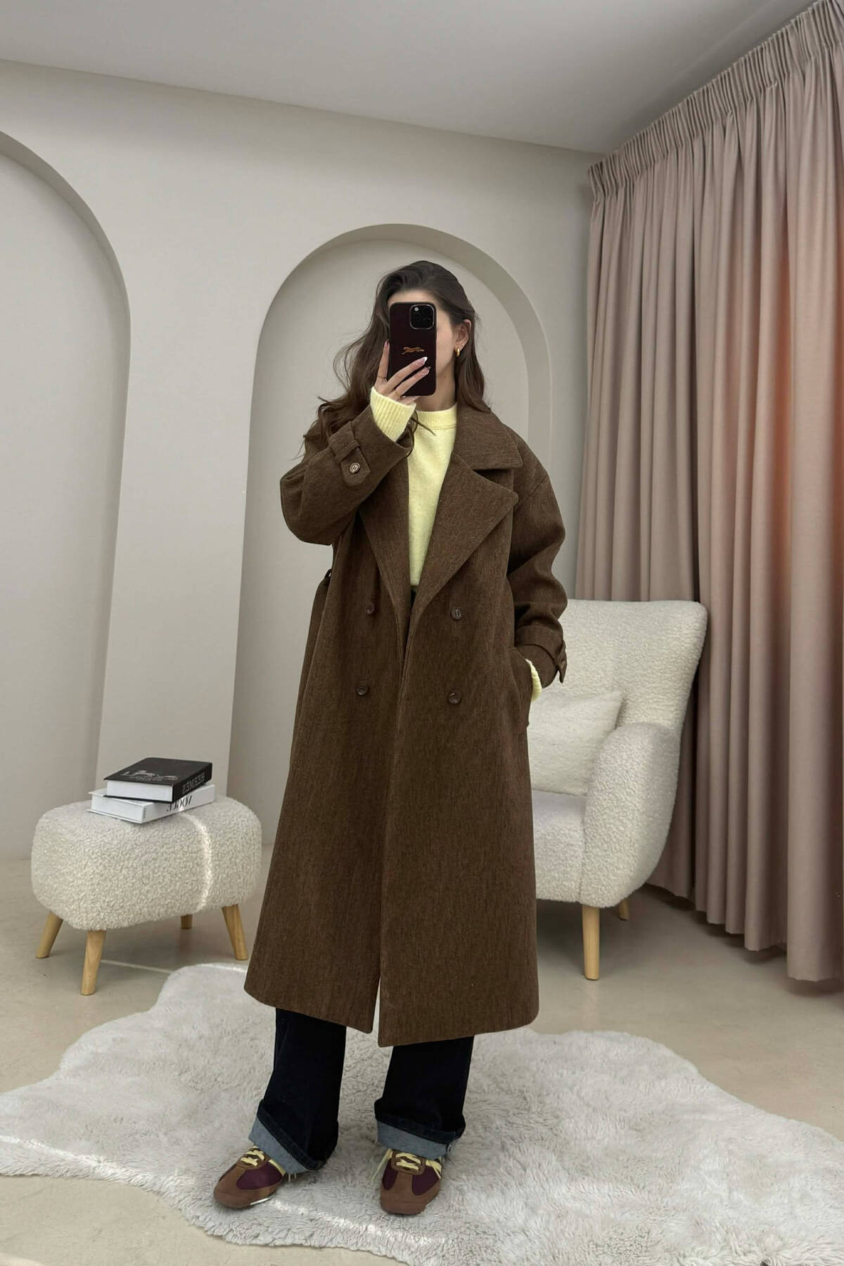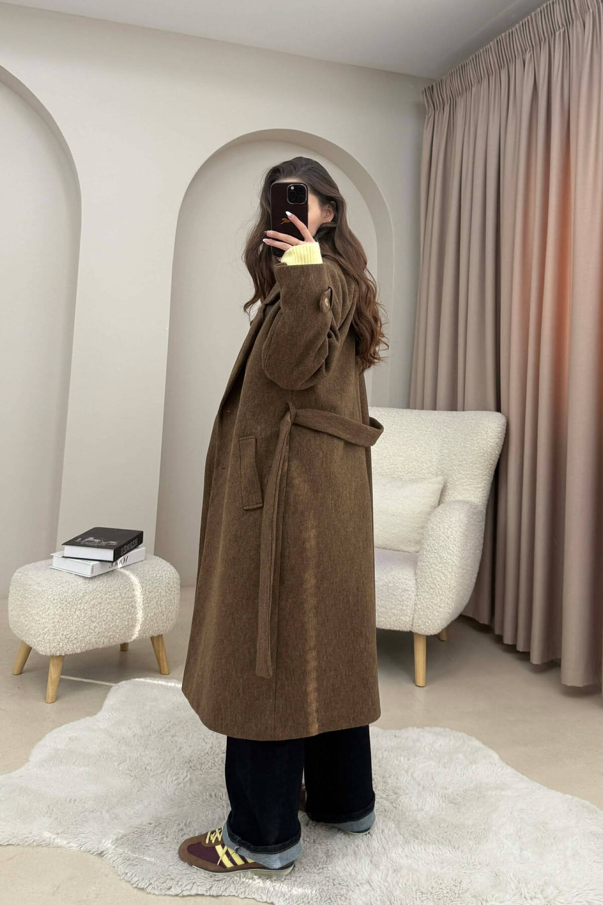 ONE COLOR LEATHER BUTTONED BELT DETAIL LONG WOMAN COAT BROWN/KAFE