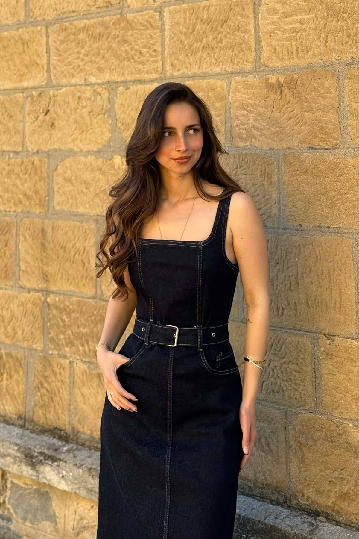ONE COLOR BELT DETAIL WOMAN DRESS DARK BLUE/BEE