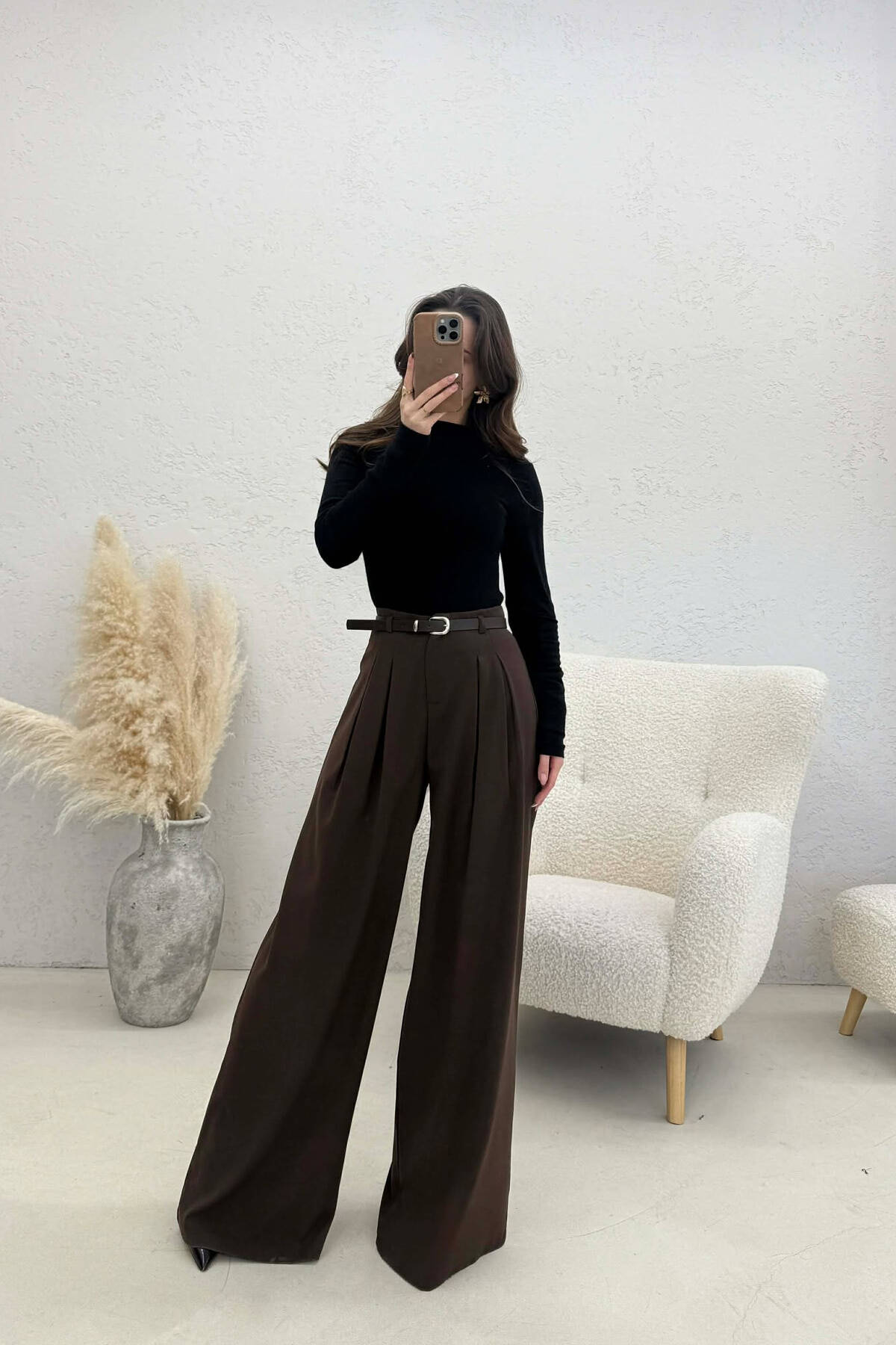 ONE COLOR BELT DETAIL WOMAN TROUSERS BROWN/KAFE