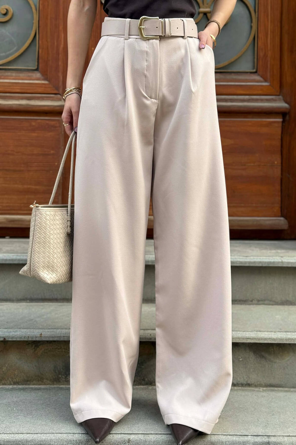 ONE COLOR BELT DETAIL WOMEN TROUSERS BEIGE/BEZHE