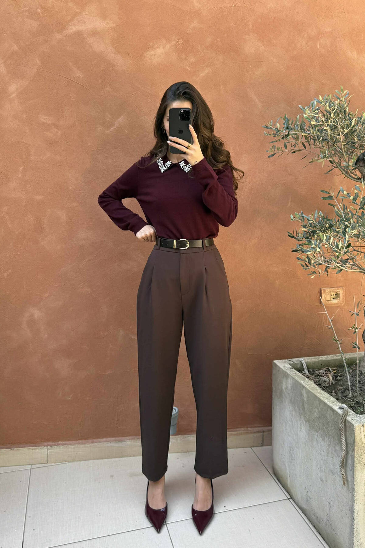 ONE COLOR BELT DETAIL WOMEN TROUSERS BROWN/KAFE