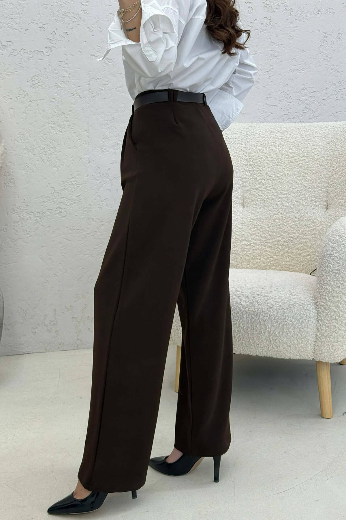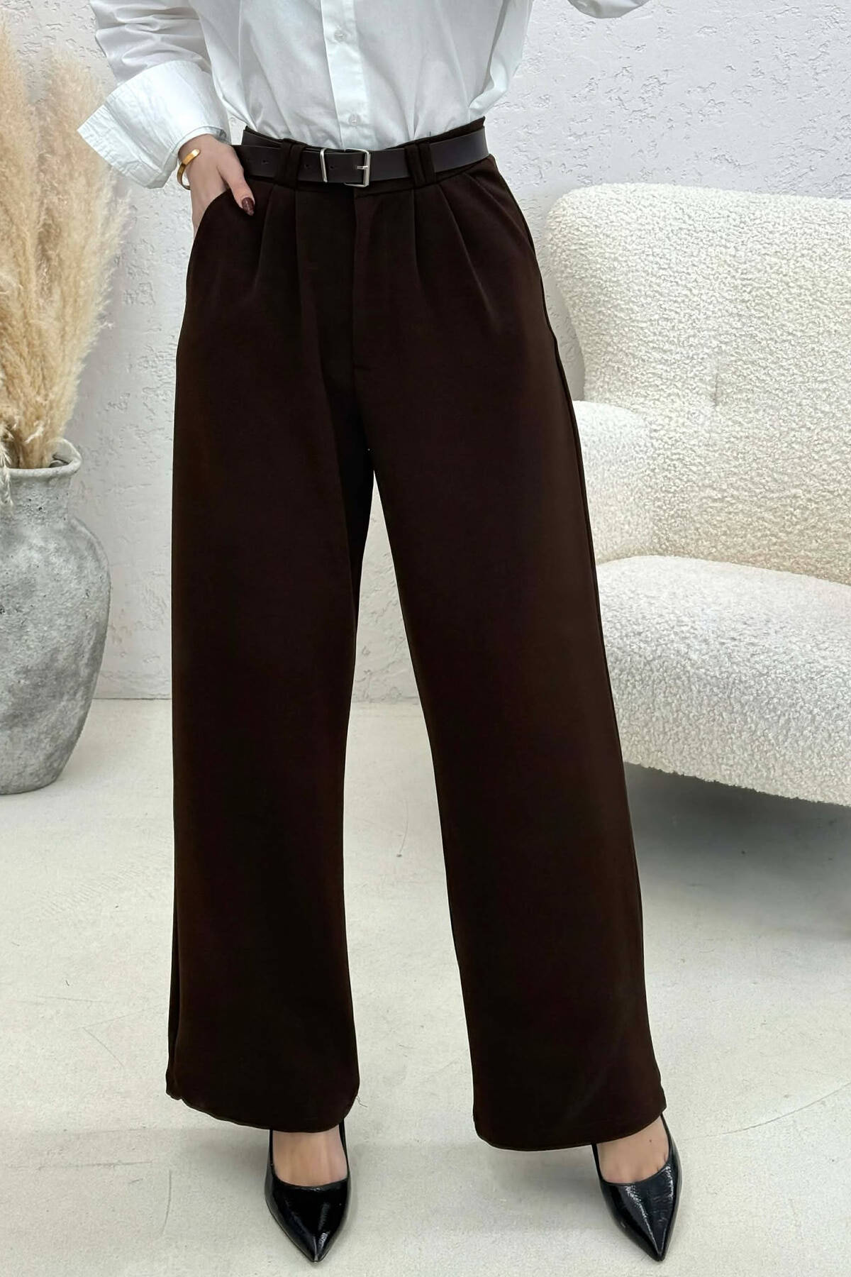 BELT DETAIL WIDE LEG WOMEN TROUSERS BROWN/KAFE