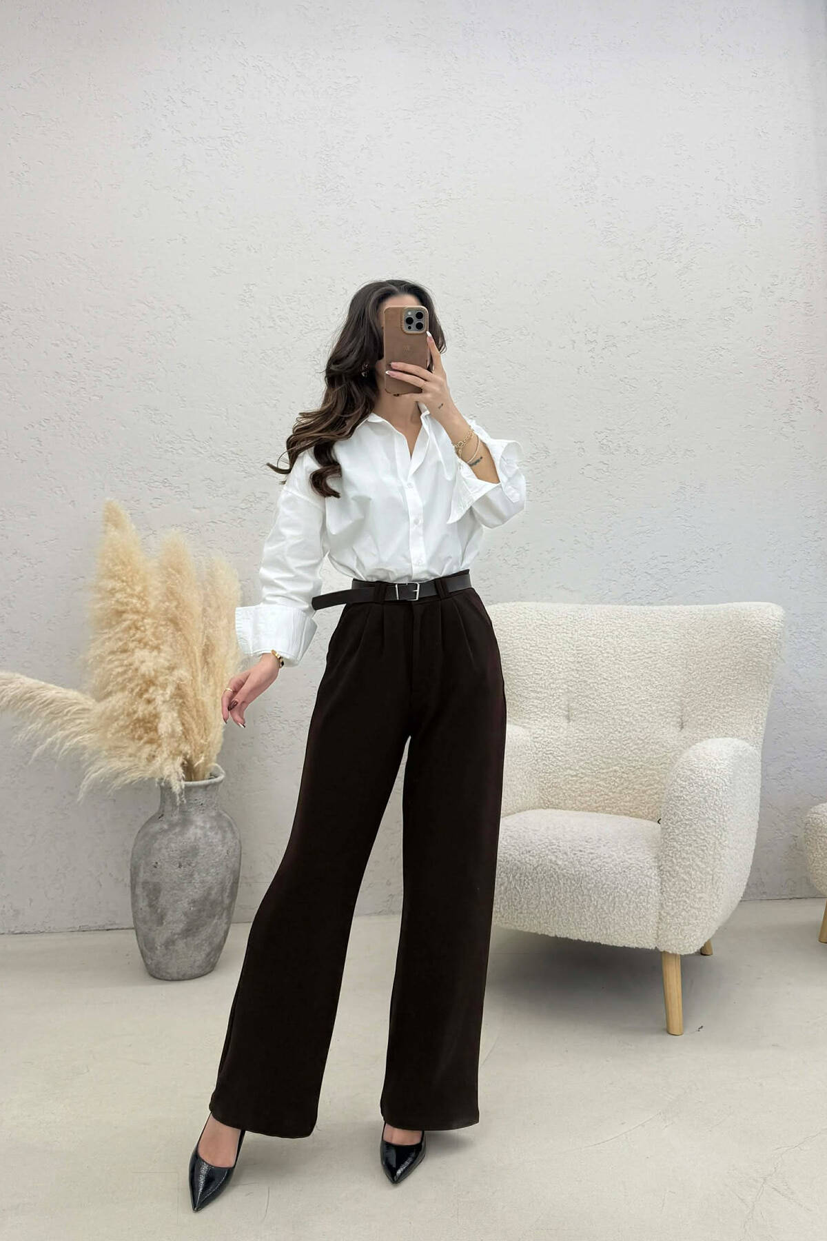 ONE COLOR SIMPLE BELT DETAIL WOMAN TROUSERS BROWN/KAFE