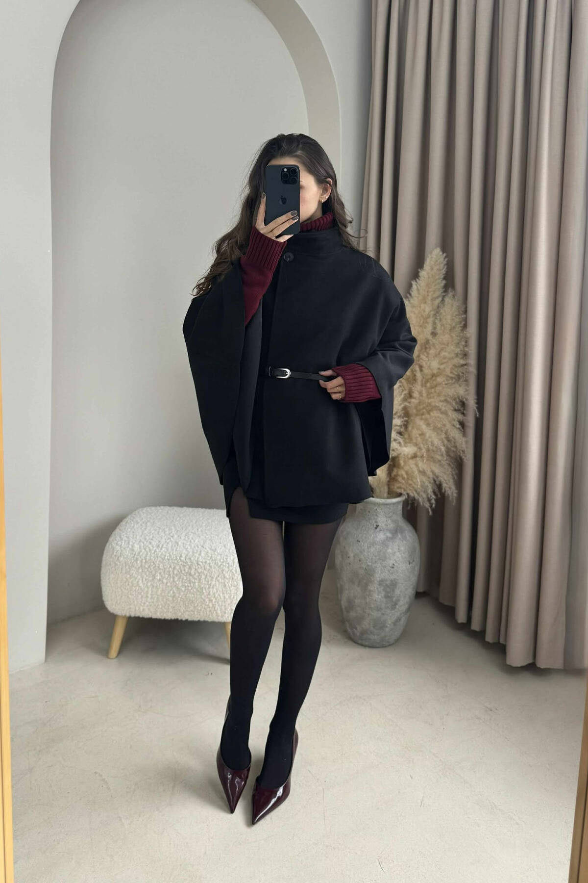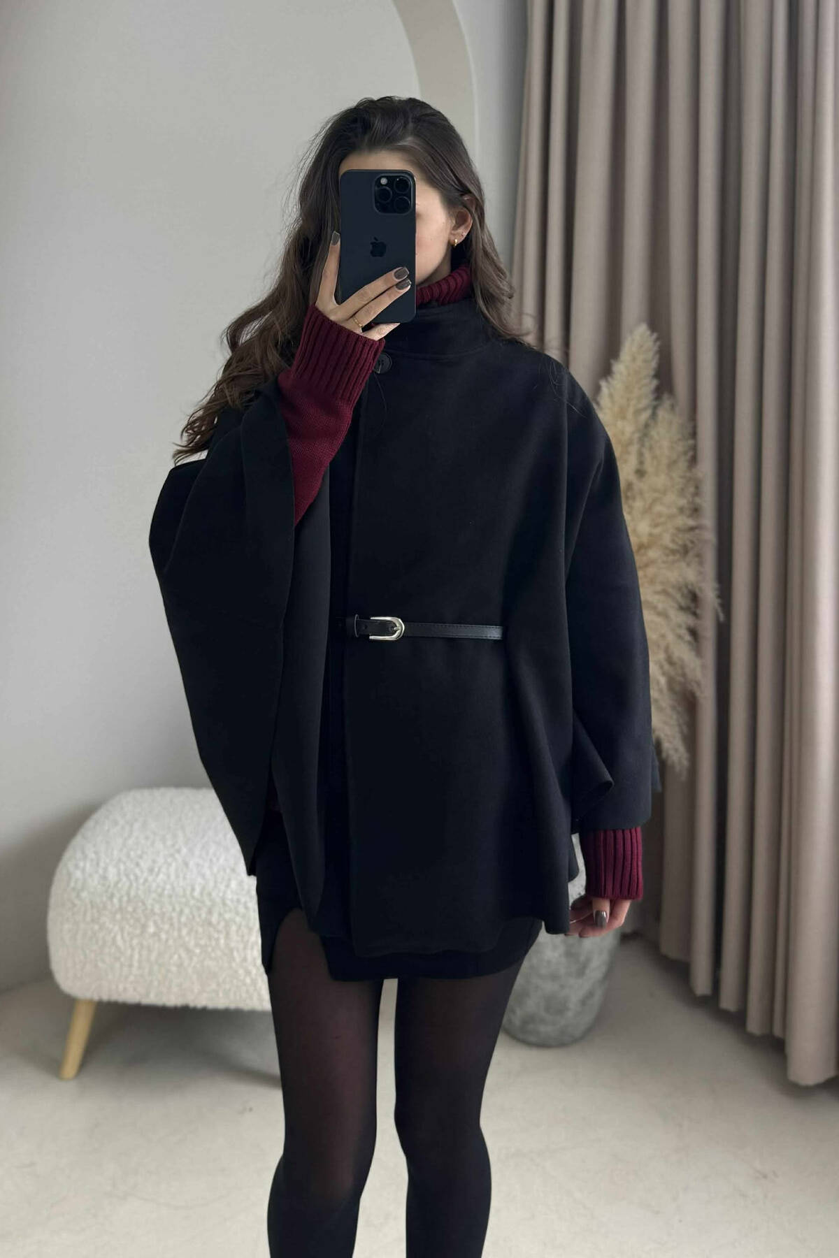 PELERINË NJË NGJYRËSHE ME DETAJIN E RRIPIT PËR FEMRA NË NGJYRË TË ZEZË