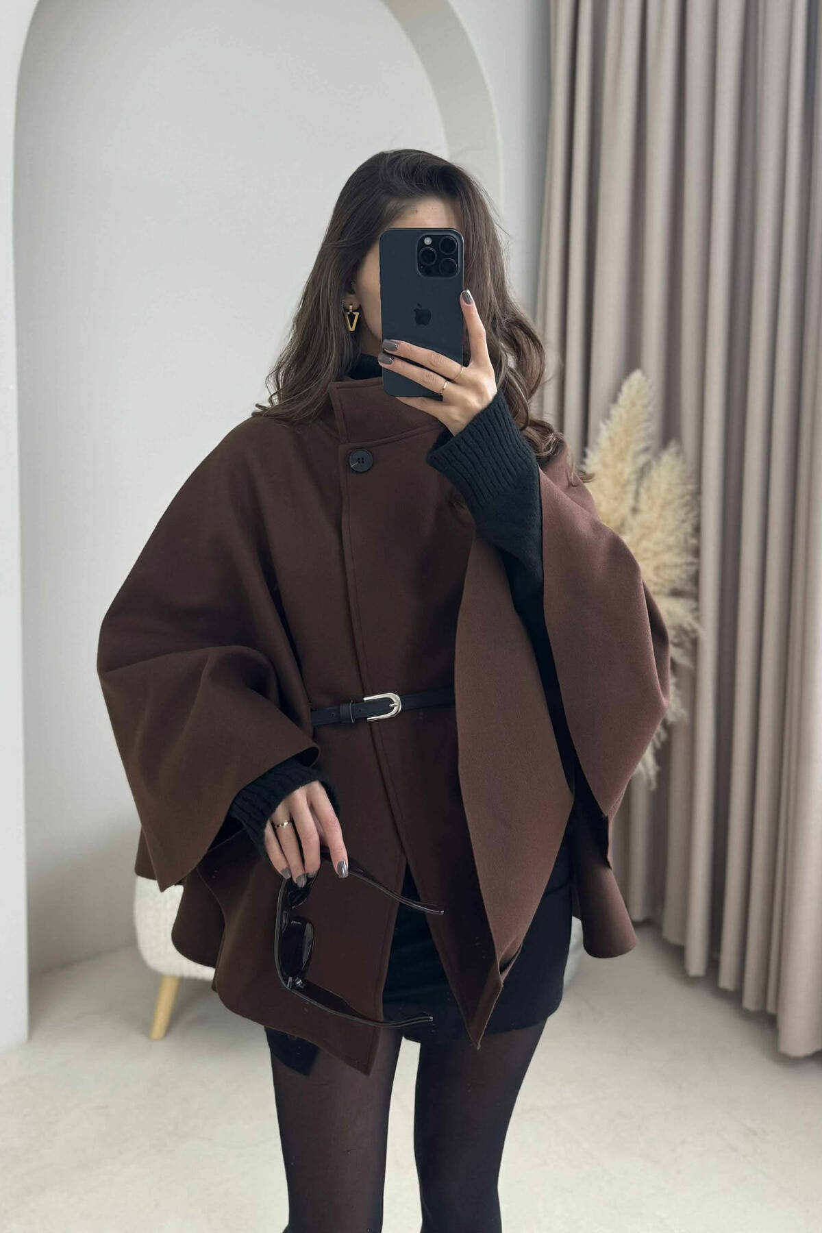 PELERINË NJË NGJYRËSHE ME DETAJIN E RRIPIT PËR FEMRA NË NGJYRË KAFE