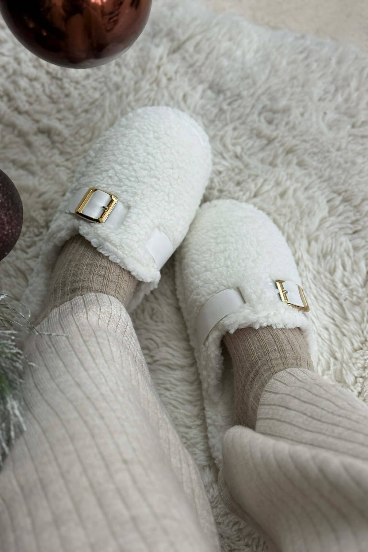 ONE COLOR BUCKLE DETAIL TEDDY WOMAN SLIPPERS WHITE-E BARDHE