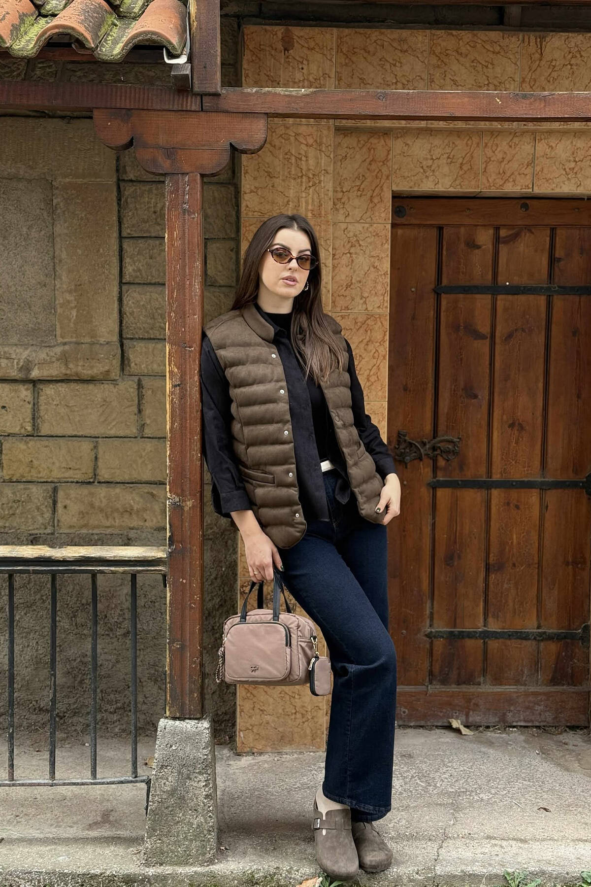 ONE COLOR BUTTON UP CHAMOIS PUFFER WOMEN VEST WITH POCKETS DARK GREEN/JEE