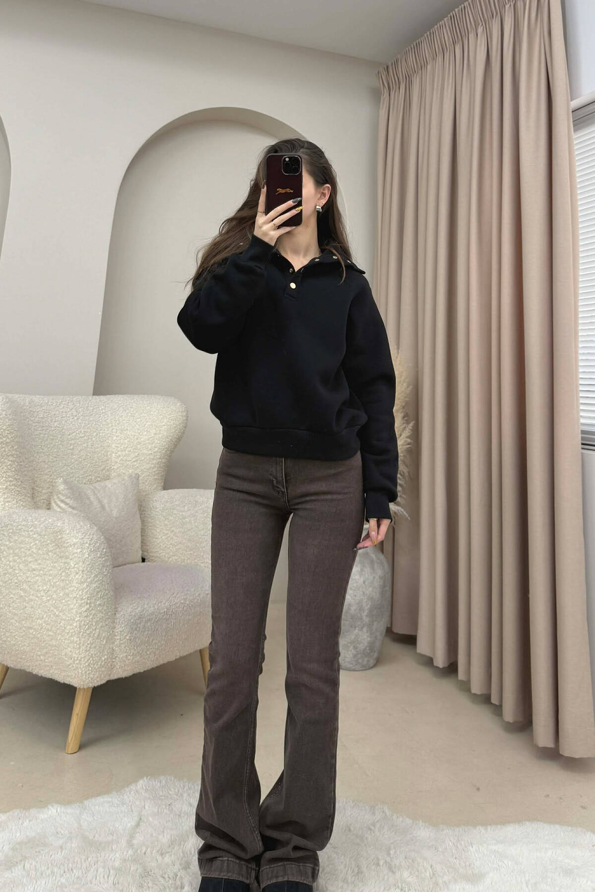 ONE COLOR BUTTONED FLUFFY WOMEN SWEATSHIRT BLACK/ E ZEZE