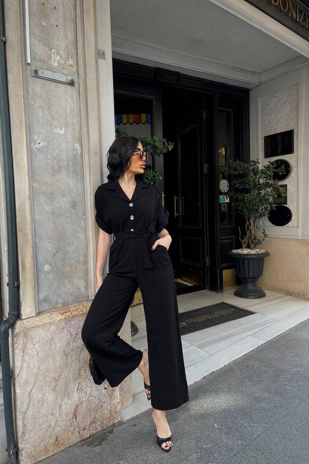 ONE COLOR BUTTONED LACING BELT WOMAN JUMPSUIT BLACK/ E ZEZE