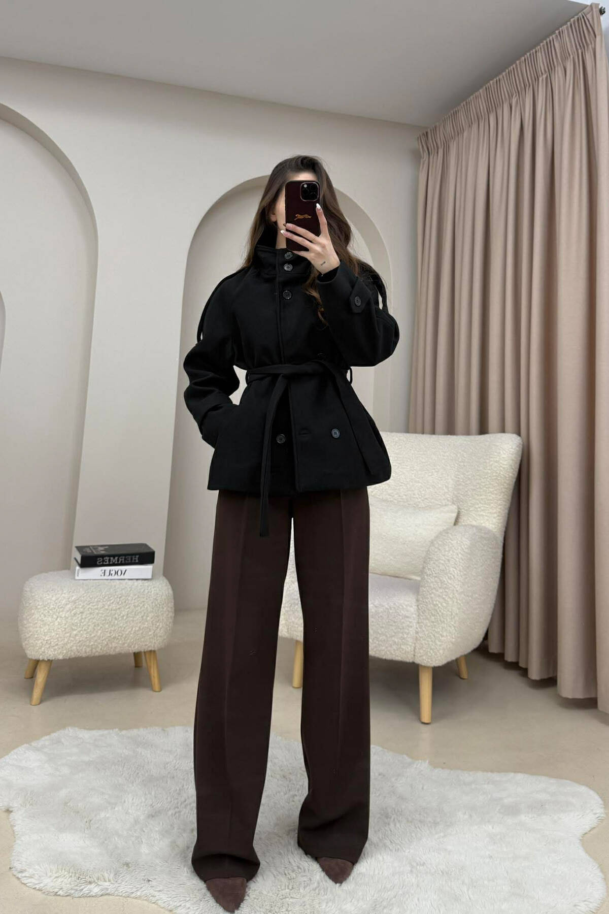 ONE COLOR LEATHER BUTTONED BELT DETAIL LONG WOMAN COAT BROWN/KAFE