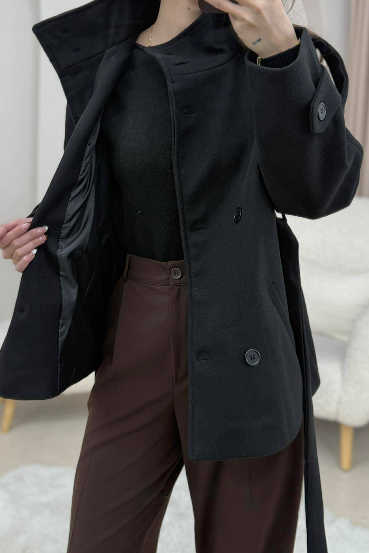 ONE COLOR BUTTONED WOMAN COAT WITH BELT BLACK/ E ZEZE