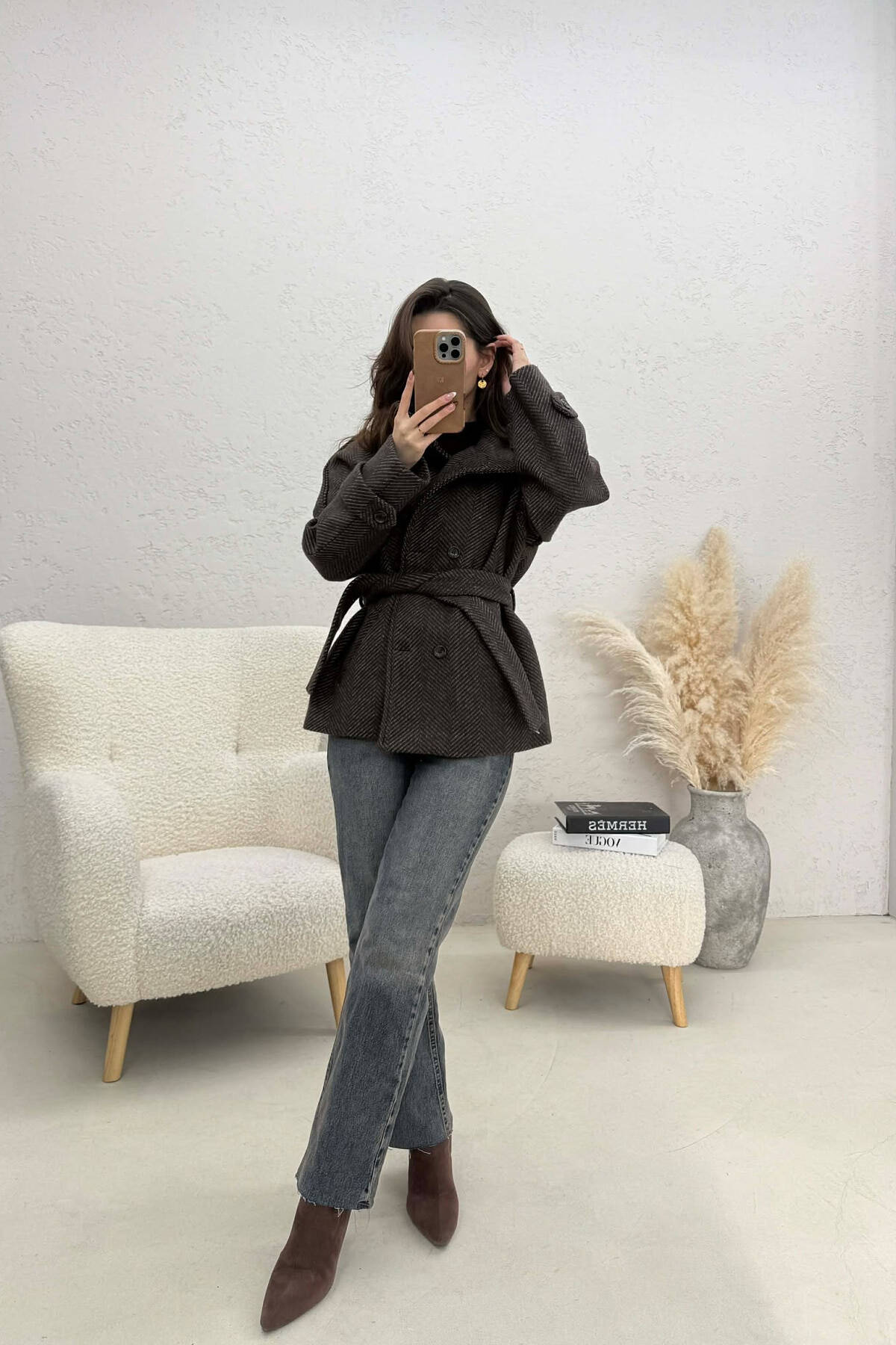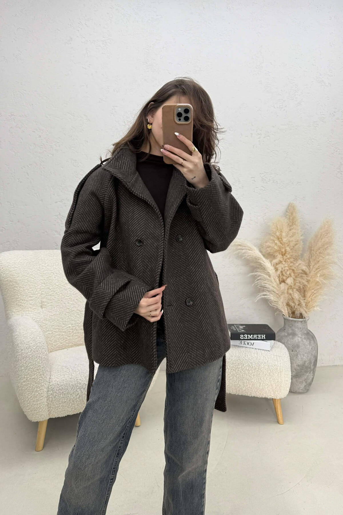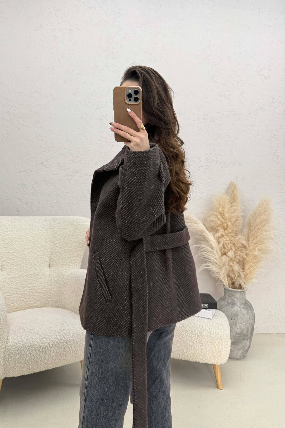 PALLTO NJE NGJYRESHE LEKURE ME KOPSA DHE ME DETAJIN E RRIPIT NE NGJYRE KAFE