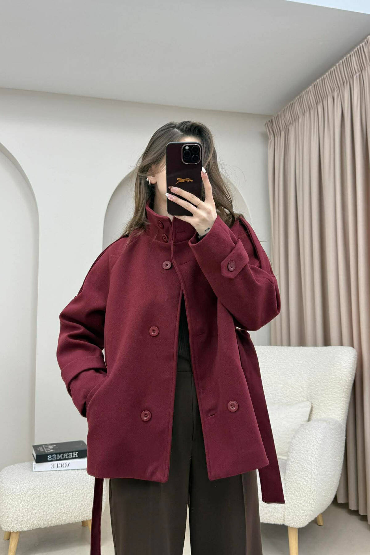 PALLTO NJE NGJYRESHE ME BUTONA DHE ME DETAJIN E RRIPIT PER FEMRA NE NGJYRE VISHNJE TE ERRET