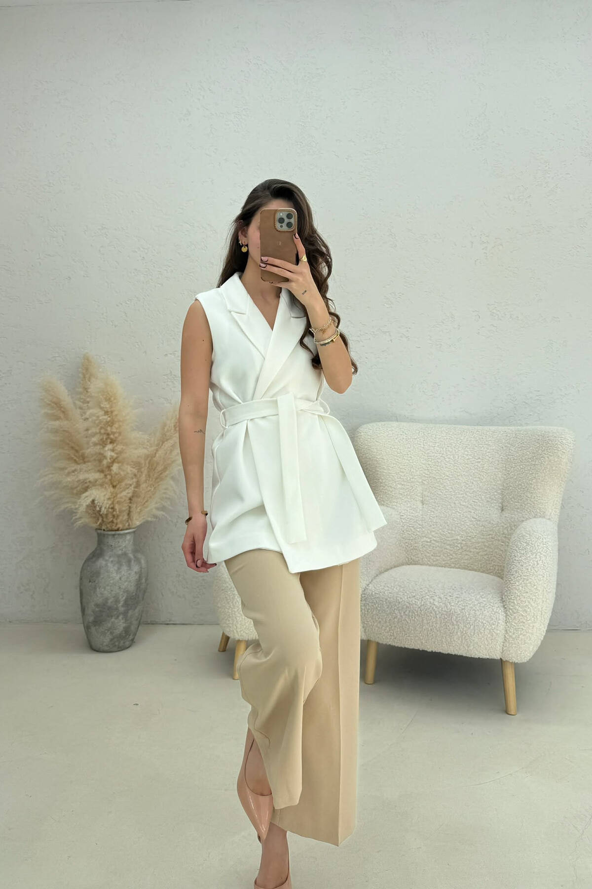 ONE COLOR BELT DETAIL WOMEN VEST BROWN/KAFE