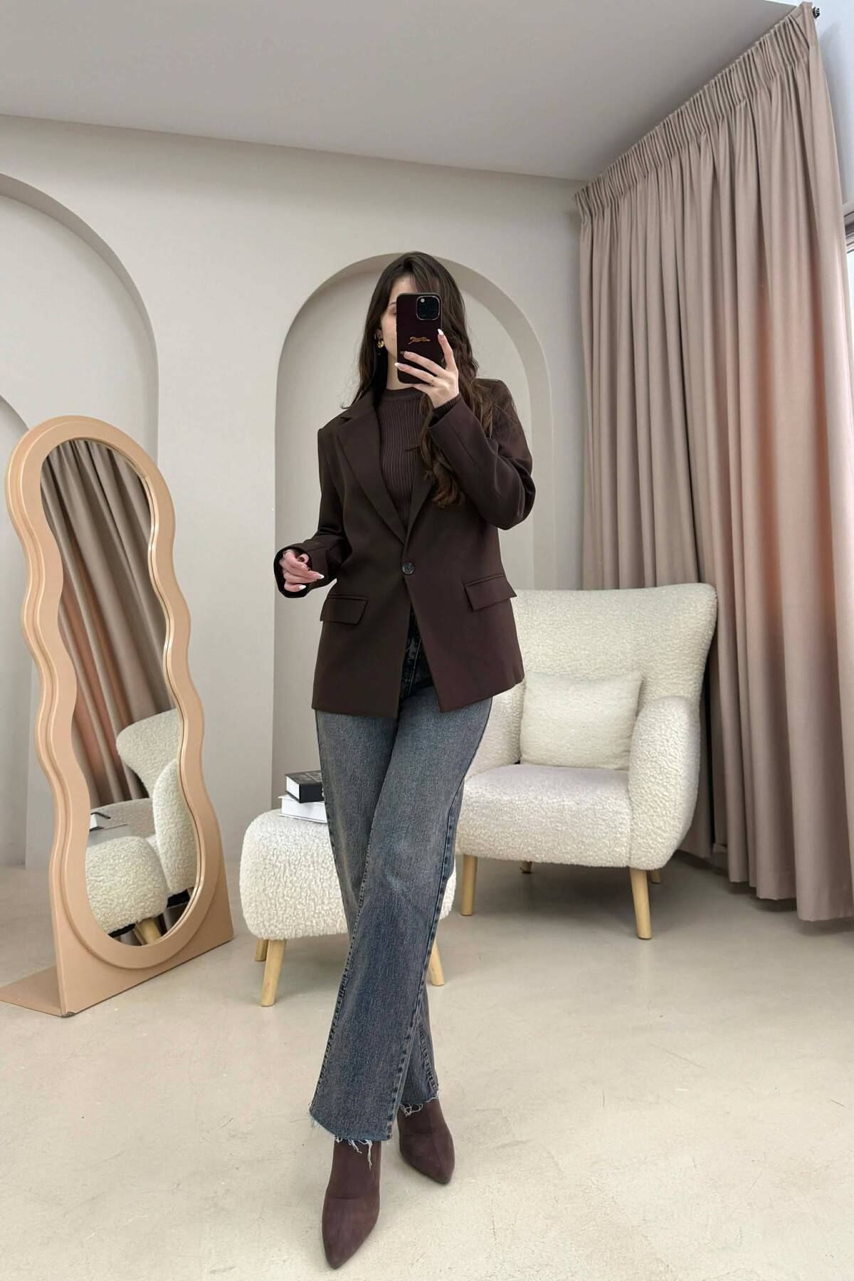 XHAKETE E SHKURTER NJE NGJYRESHE ME DETAJIN E RRIPIT PER FEMRA NE NGJYRE KAFE