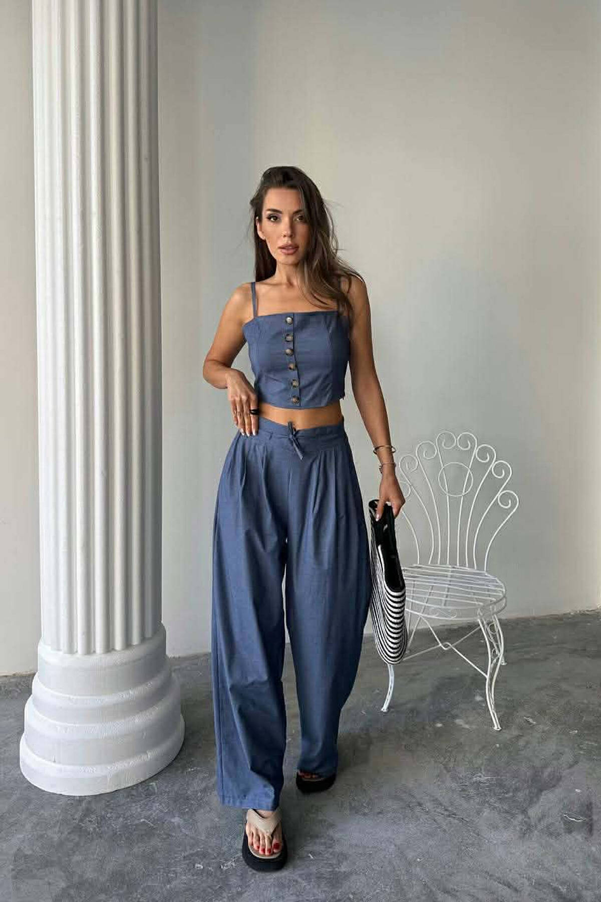 ONE COLOR CROP TOP+TROUSERS WOMEN SET BLUE/BLU