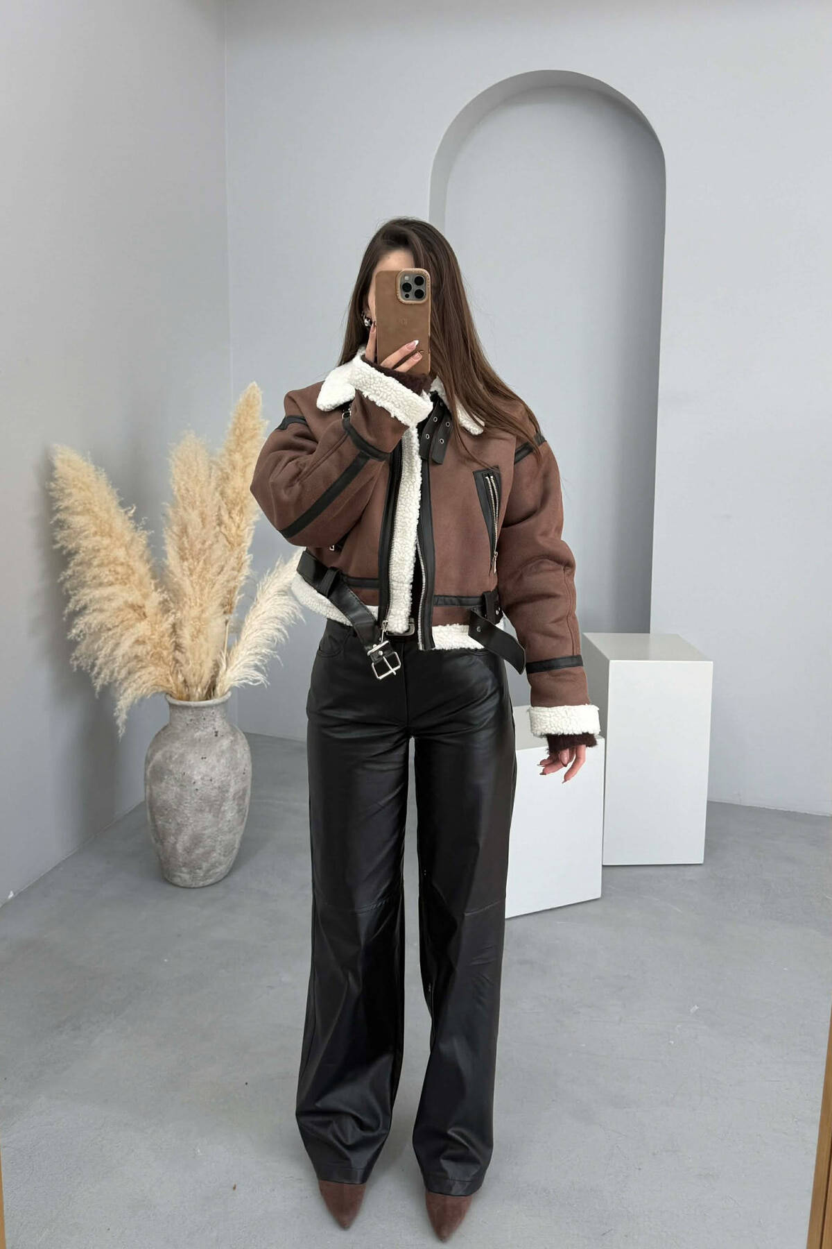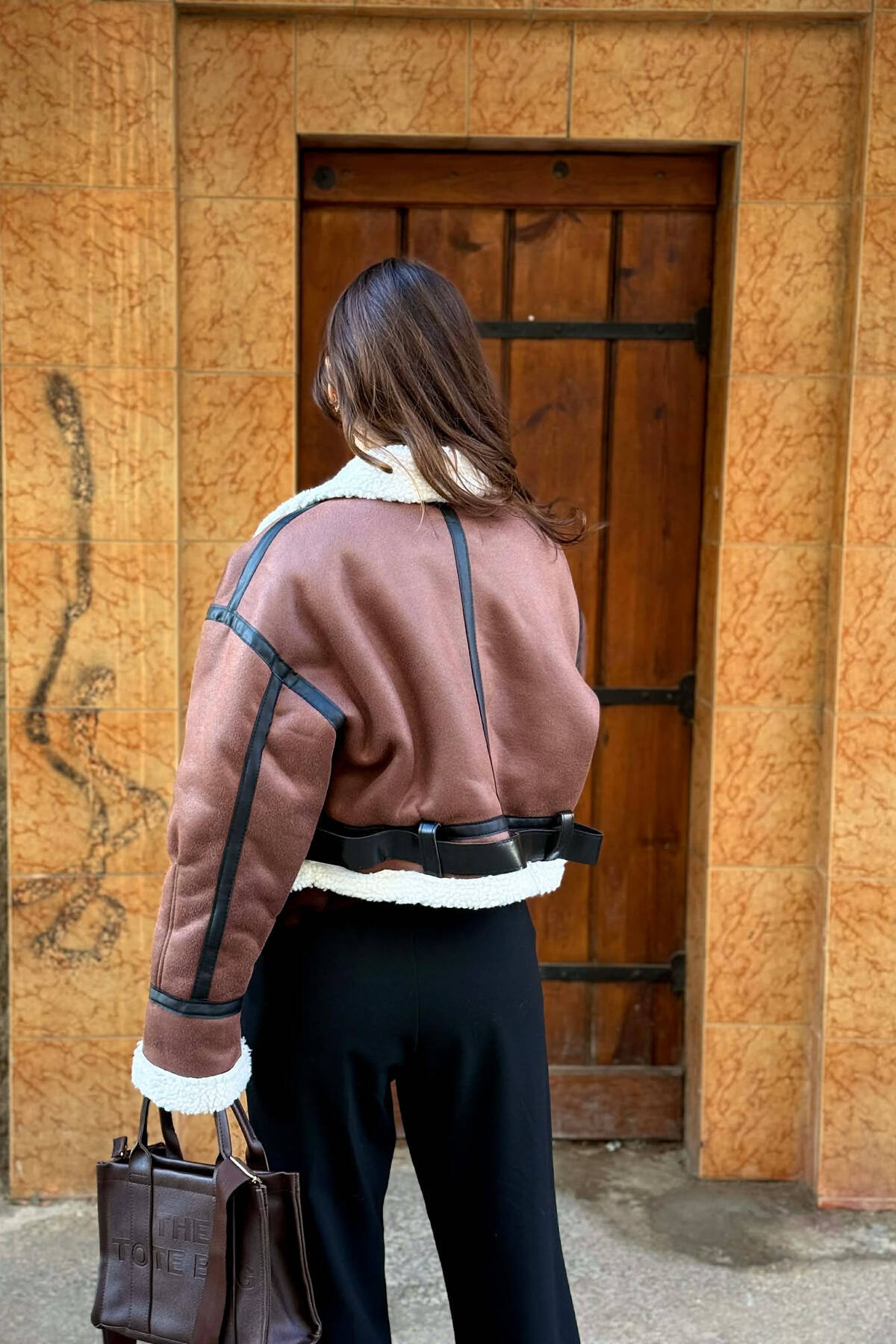 ONE COLOR CROPPED BELT DETAIL WOOL WOMAN JACKET DARK BROWN/KAFE ERRET