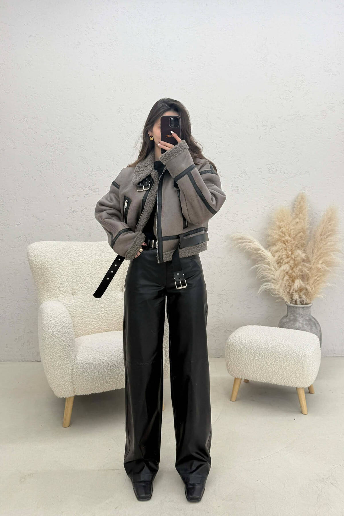 ONE COLOR CROPPED BELT DETAIL WOOL WOMAN JACKET DARK GREY/GEE