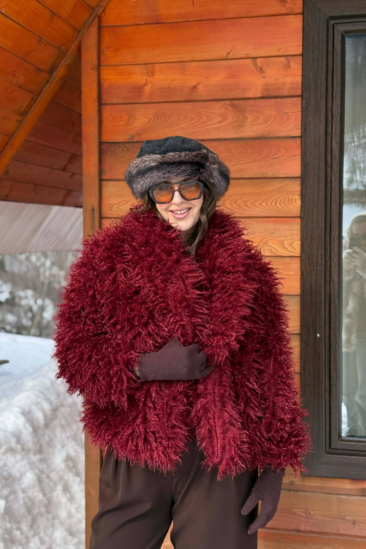 ONE COLOR CURLY FAUX FUR WOMAN COAT BURGUNDY/VISHNJE