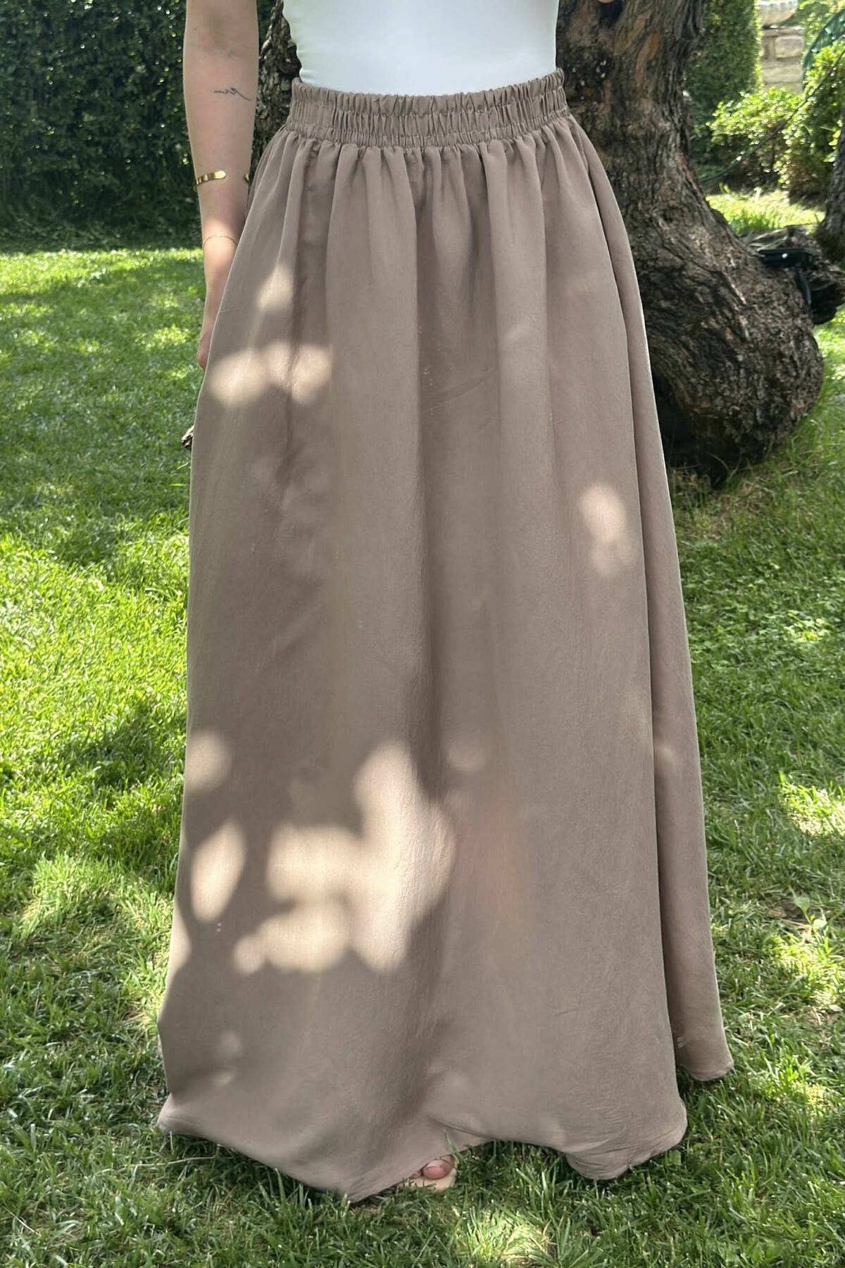 ONE COLOR EALSTIC SIMPLE LONG WOMEN SKIRT LIGHT BROWN/KAZB