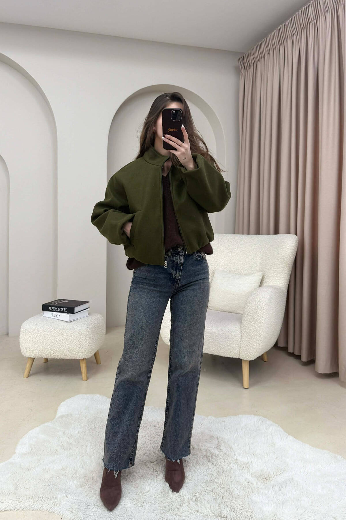 DETACHABLE FAUX FUR COLLAR CROPPED WOMAN COAT CREAM/KREM