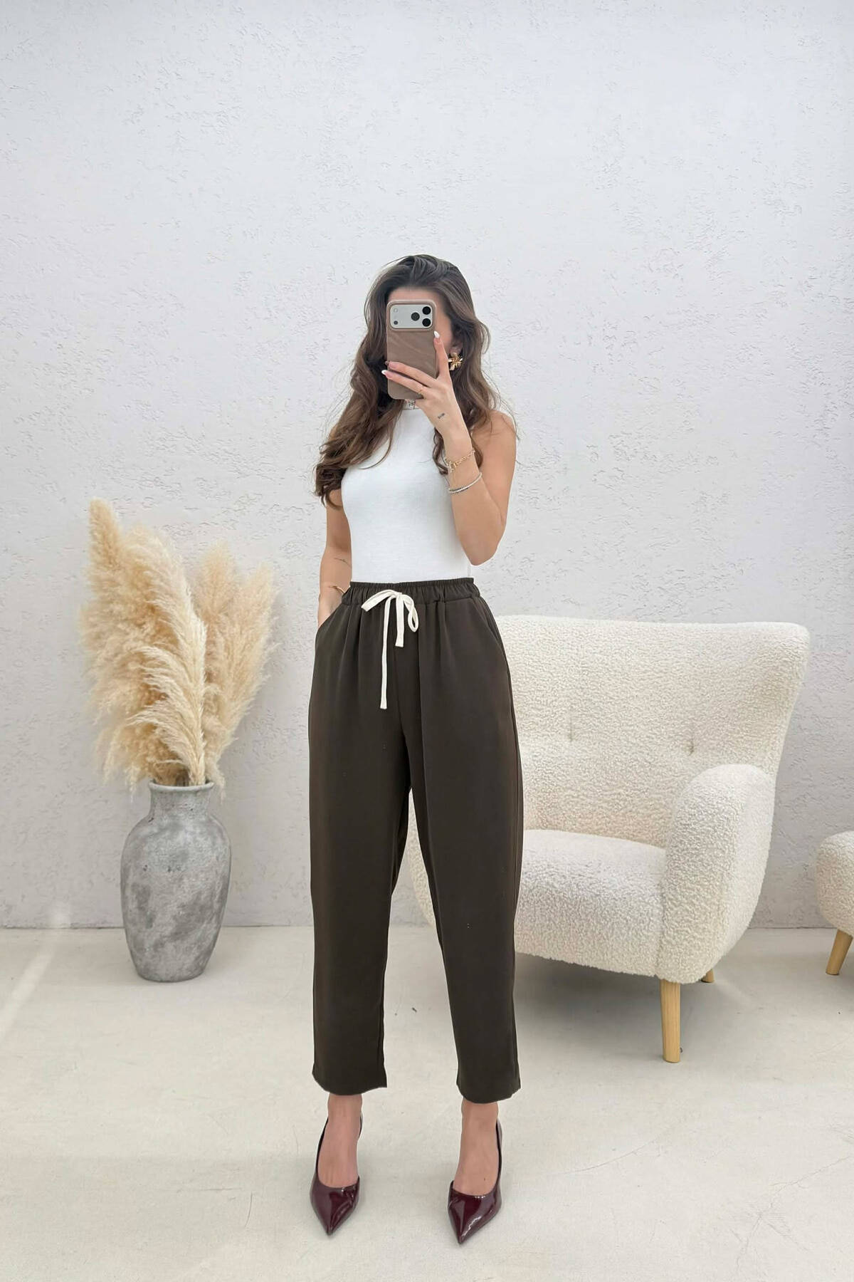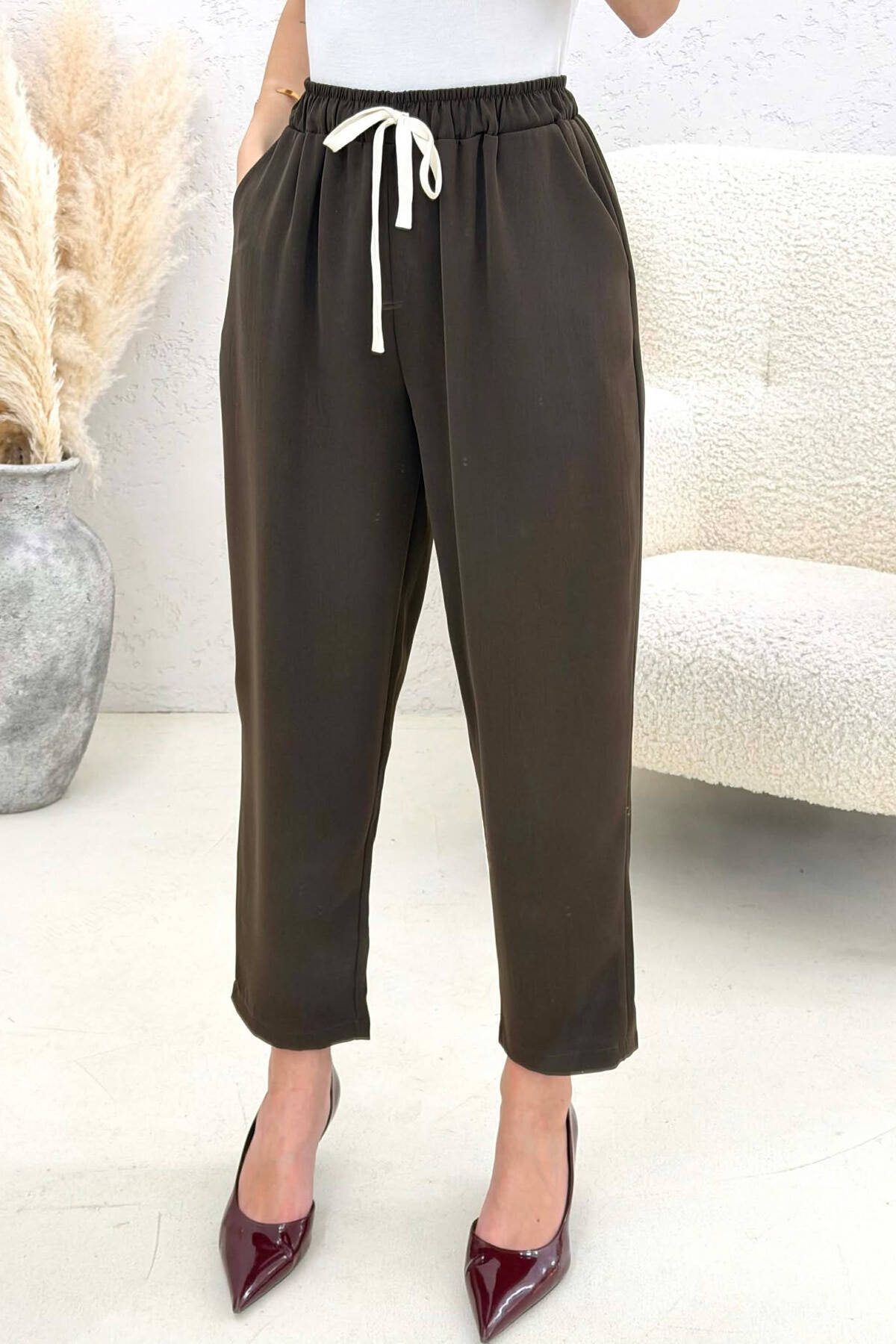 ONE COLOR ELASTIC WAIST WOMAN TROUSERS BROWN/KAFE