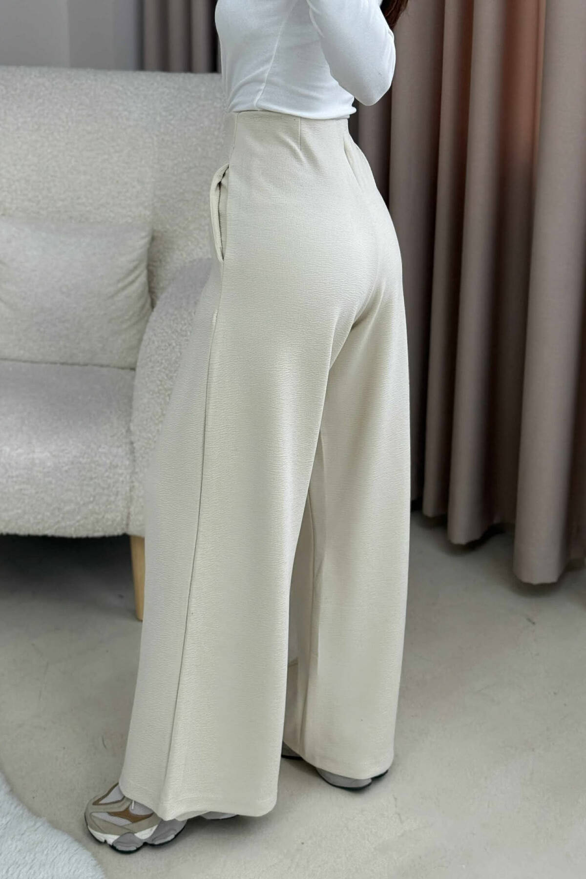 ONE COLOR ELASTIC WAIST WIDE LEG WOMEN TROUSERS CREAM/KREM