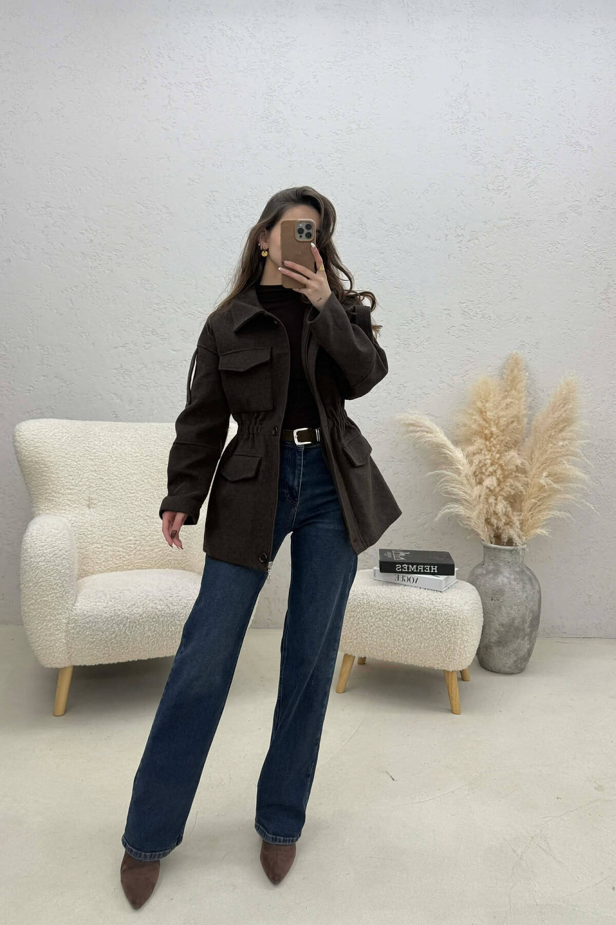 ONE COLOR LEATHER BUTTONED BELT DETAIL LONG WOMAN COAT BROWN/KAFE