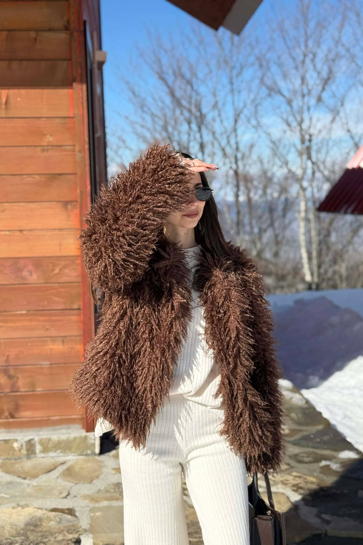 ONE COLOR FAUX FUR WOMAN COAT BROWN/KAFE