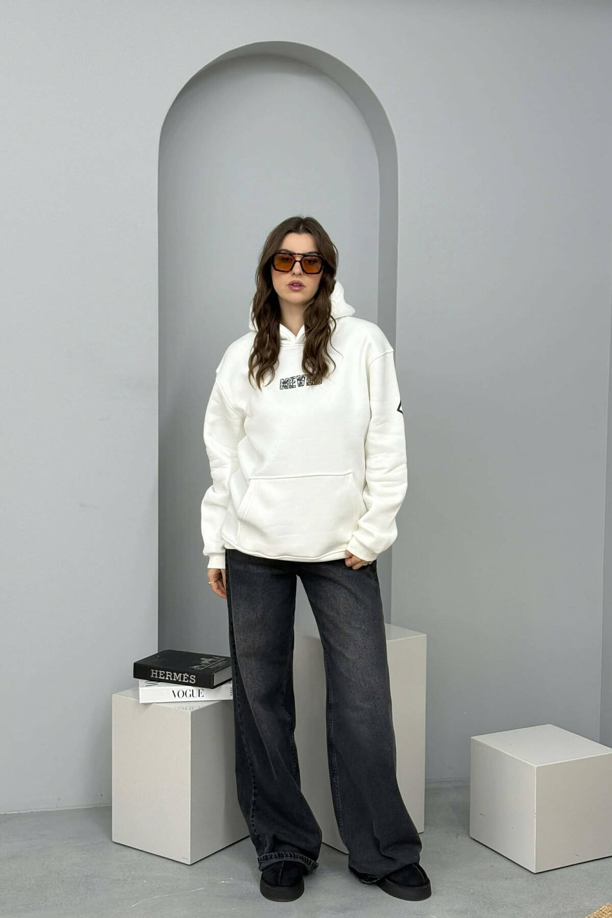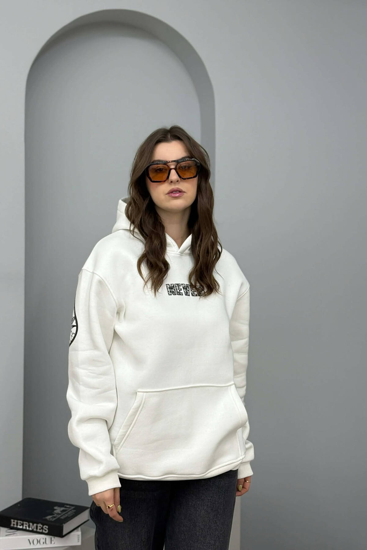 FLUFFY ONE COLOR FRONT WRITTING WOMEN HOODIE CREAM/KREM