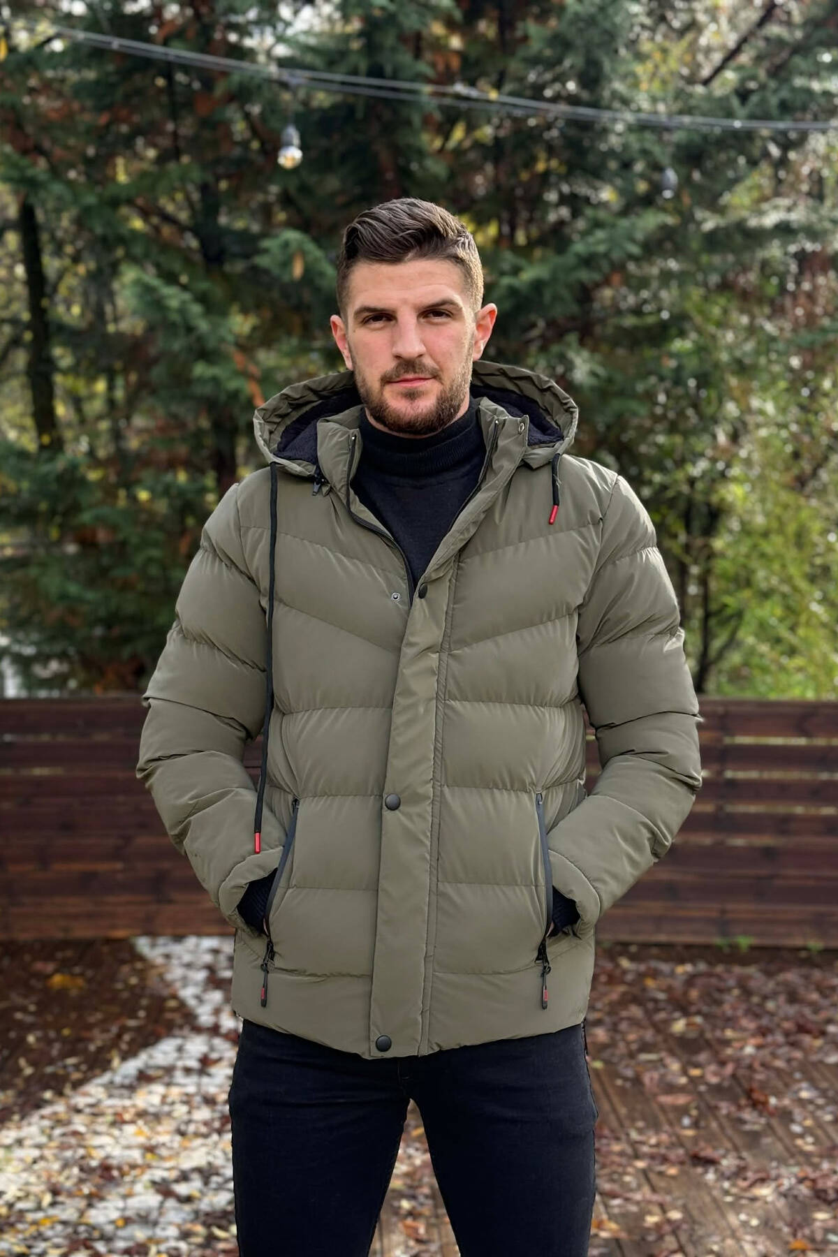 ONE COLOR FLUFFY HOODED MEN PUFFER JACKET OLIVE/ULLI