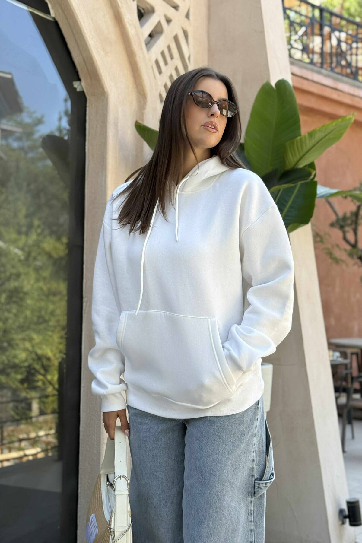FLUFFY ONE COLOR FRONT WRITTING WOMEN HOODIE CREAM/KREM