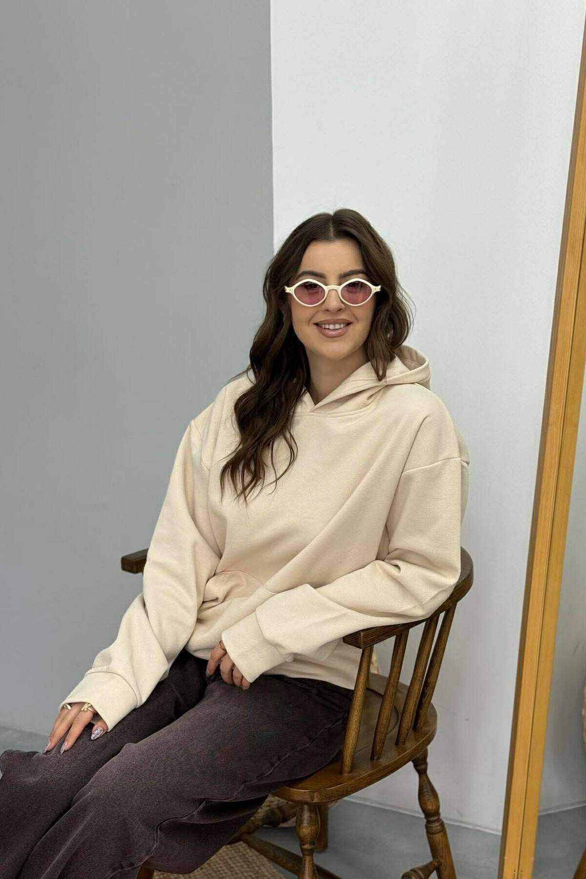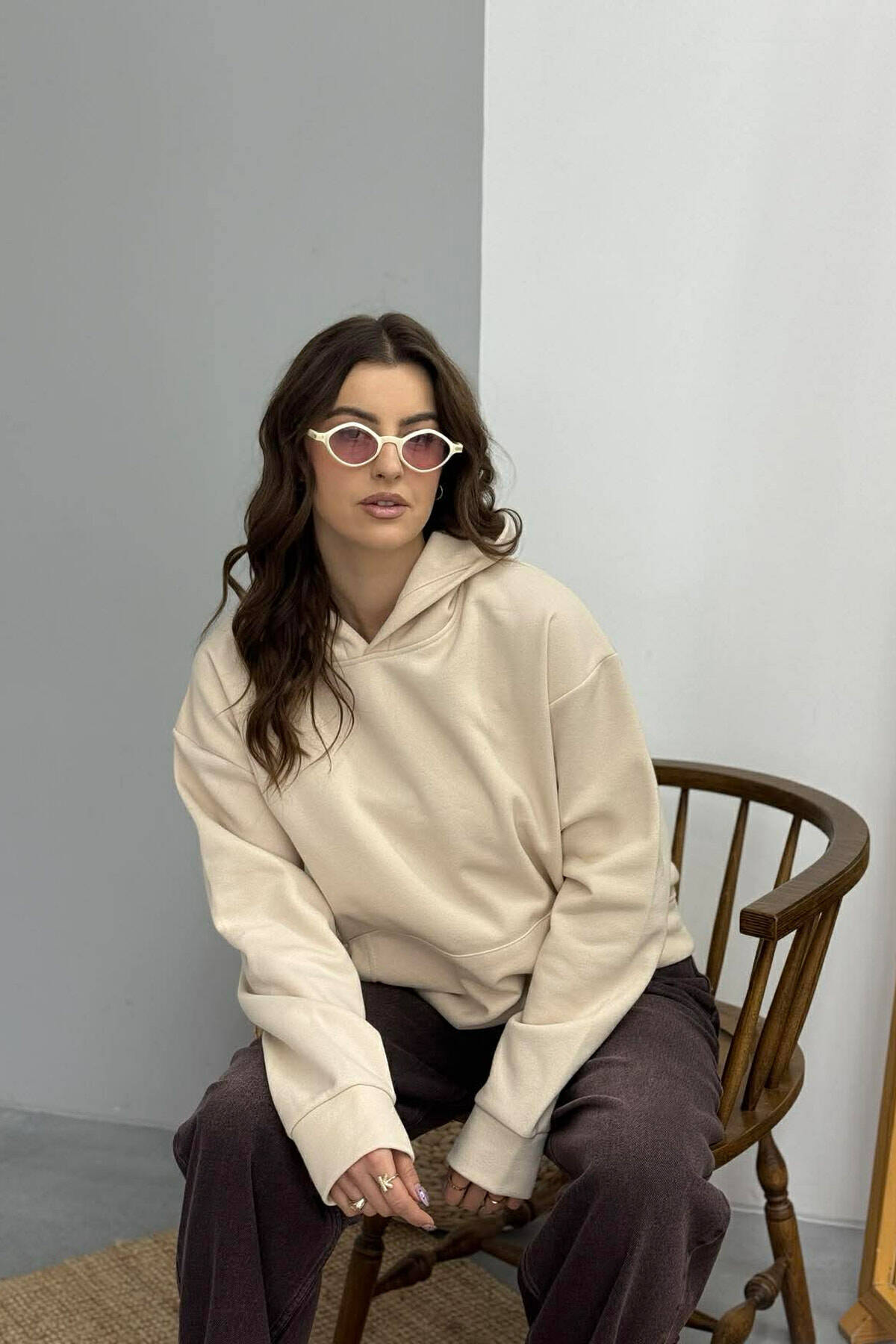 FLUFFY ONE COLOR FRONT WRITTING WOMEN HOODIE CREAM/KREM