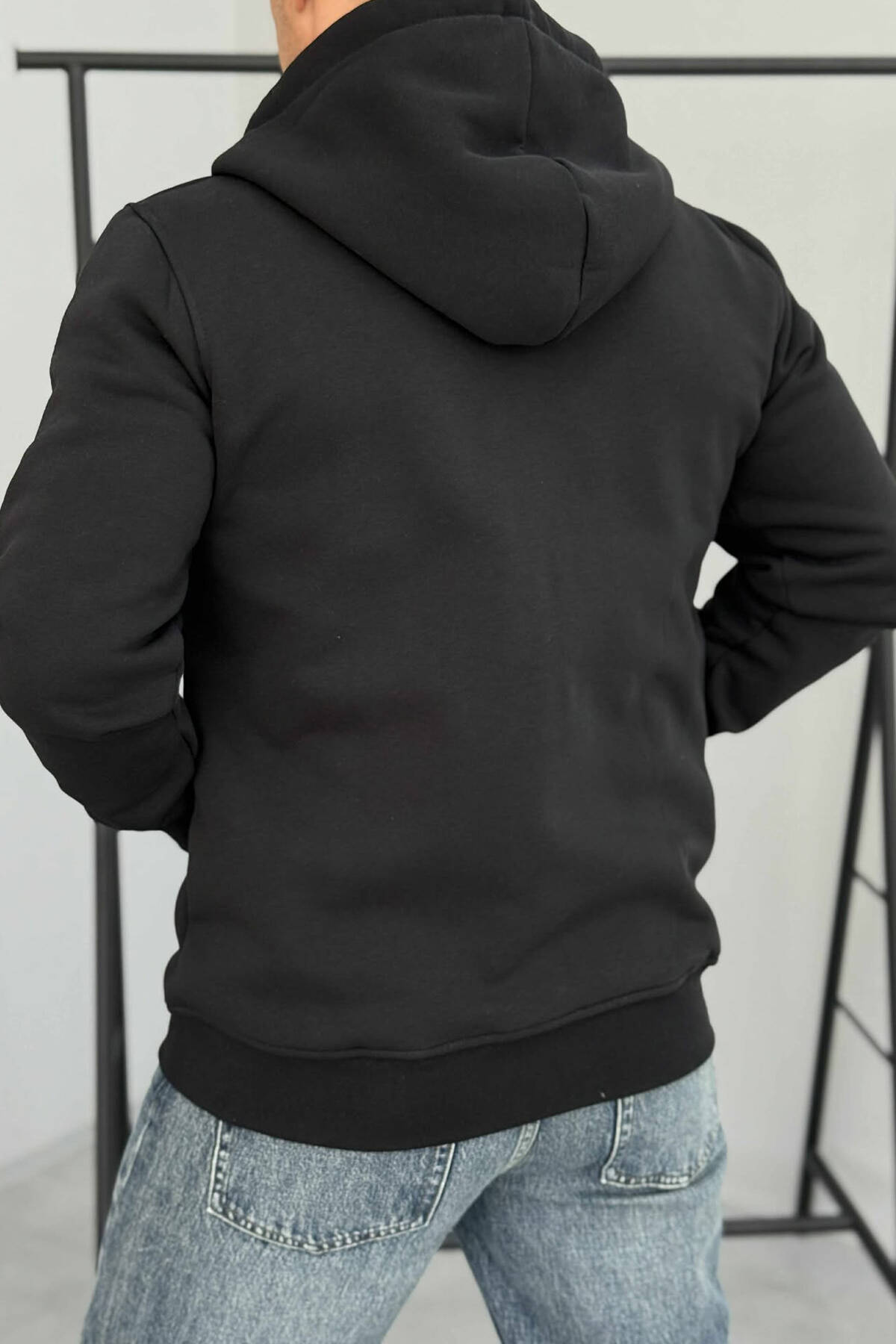 ONE COLOR FLUFFY ZIPPER HOOD MEN JACKET BLACK/ E ZEZE