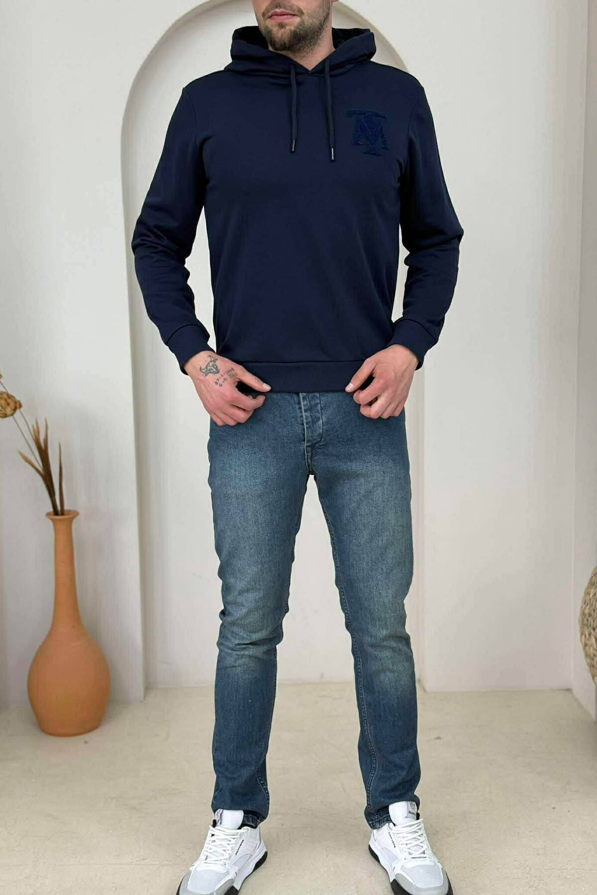 HOODIE NJE NGJYRESHE ME PUSH DHE DETAJE TE VOGLA PER MESHKUJ NE NGJYRE BLU