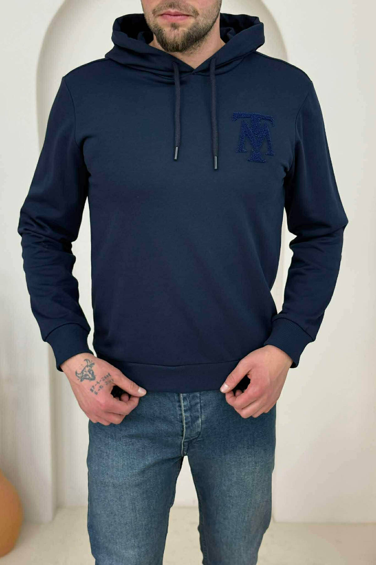HOODIE E THJESHTË NJË NGJYRËSHE PËR MESHKUJ NË NGJYRËN BLU TË ERRËT