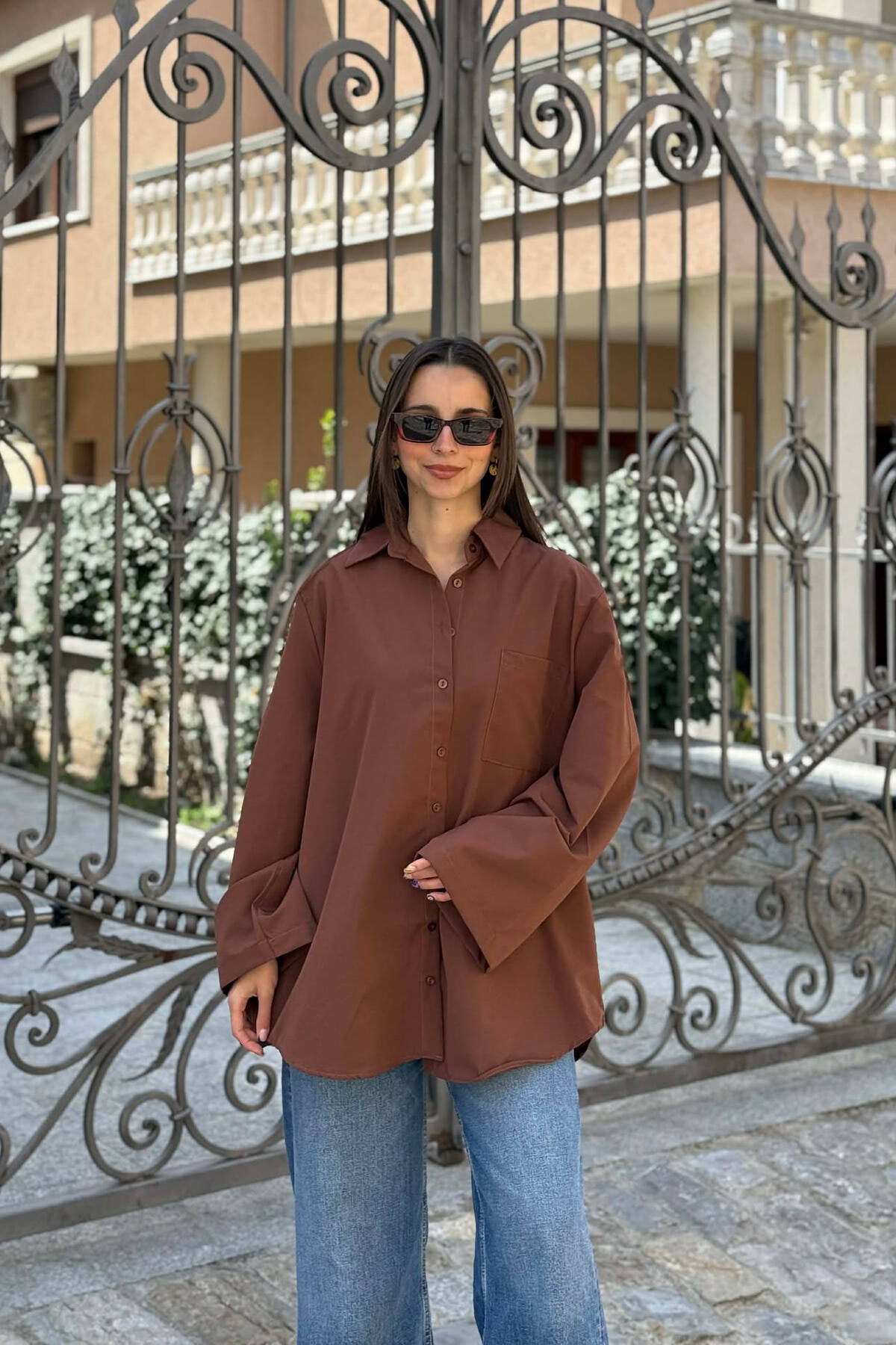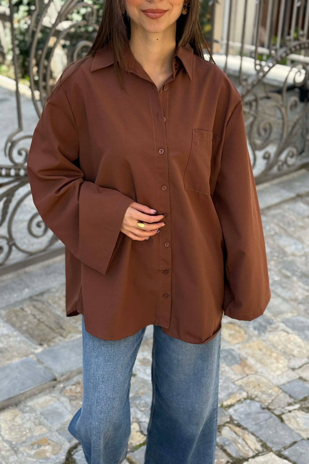 ONE COLOR FRONT POCKET WOMAN SHIRT BROWN/KAFE