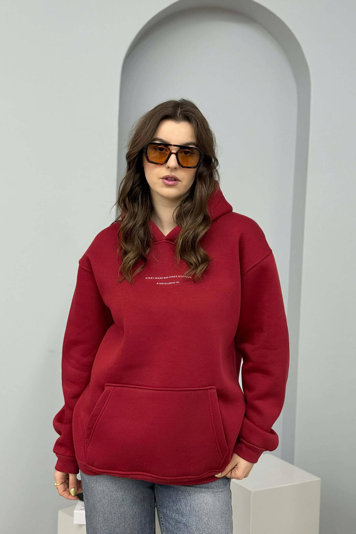 HOODIE NJE NGJYRESHE ME PUSH DHE ME SHKRIM TE THJESHTE NE PJESEN PARA PER FEMRA NE NGJYRE VISHNJE