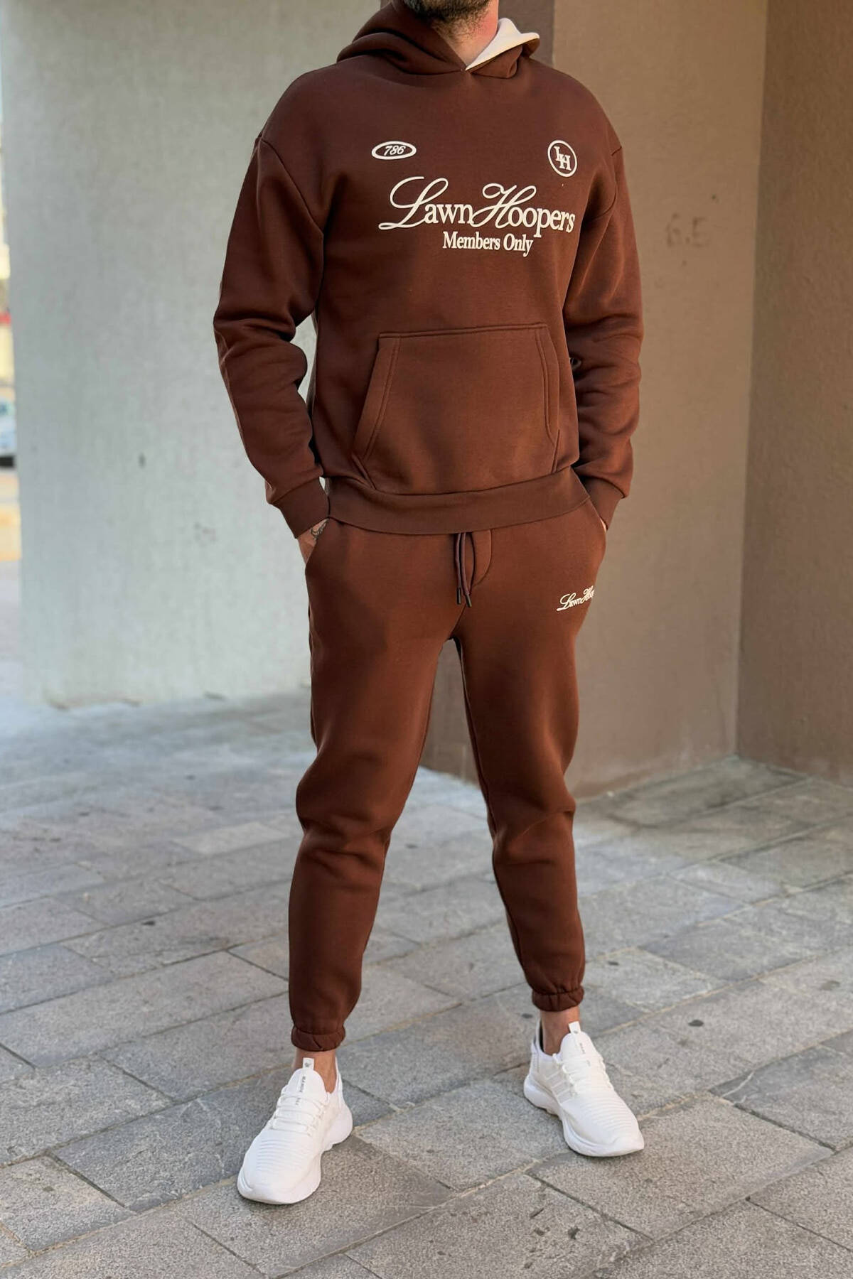 ONE COLOR FRONT WRITTINGS HOODIE+JOGGERS MEN SET BROWN/KAFE