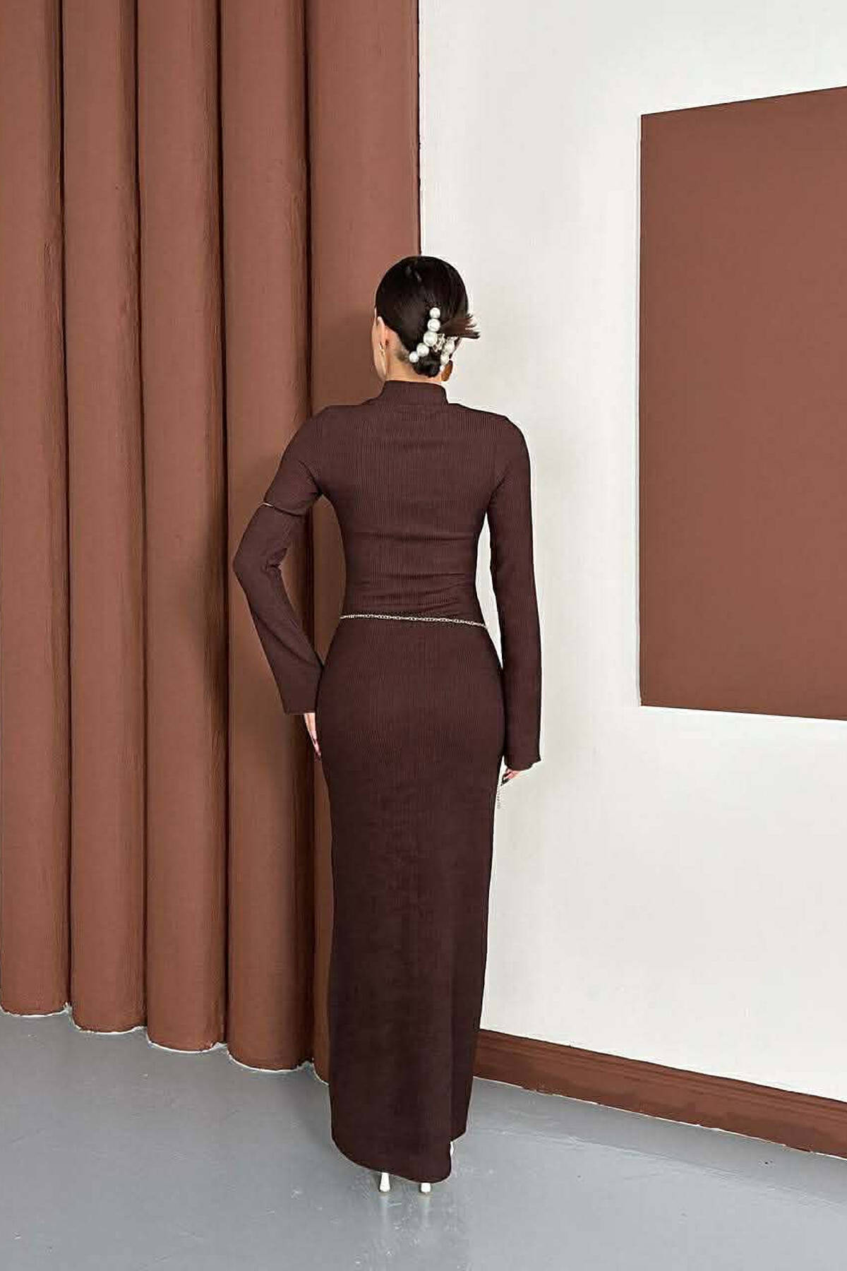 LONG SLEEVE BELT DETAIL WOMAN DRESS BROWN/KAFE