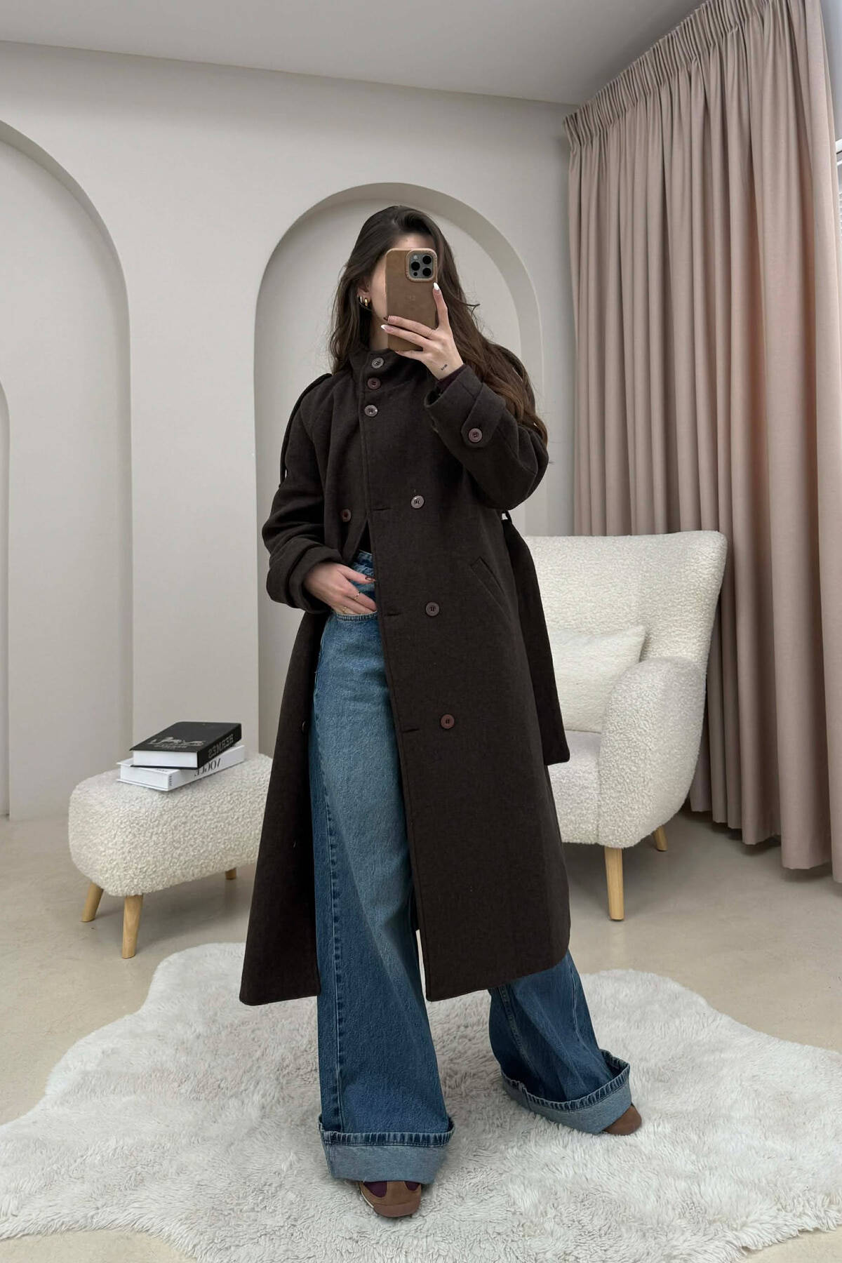 ONE COLOR HIGH NECK BUTTONED WOMAN COAT DARK BROWN/KAE